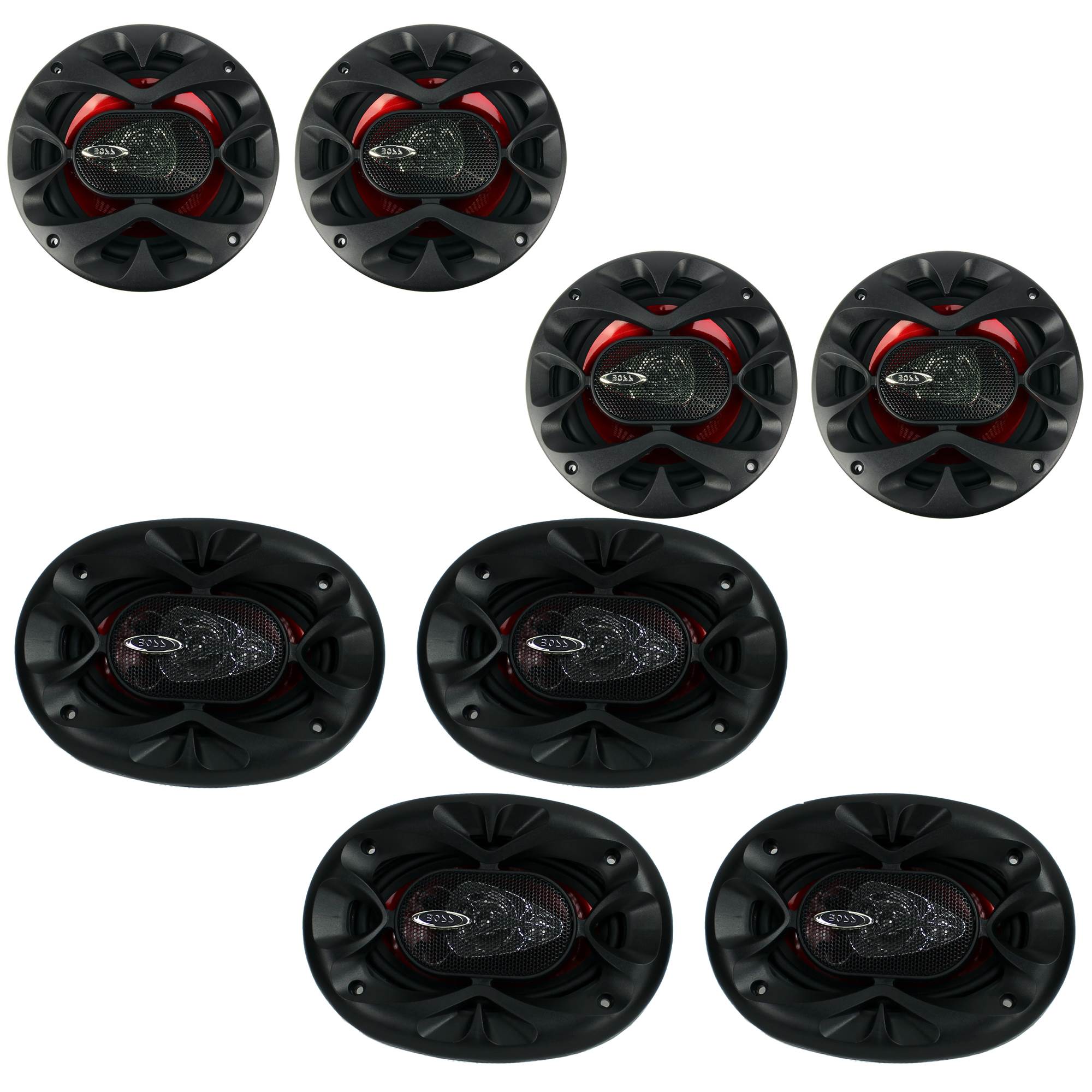 This car audio package includes 8 speakers from the Boss Chaos Exxtreme Series: 4 CH6530 6.5-Inch 300-Watt speakers, and 4 CH4630 4-by-6-Inch 250-Watt speakers.