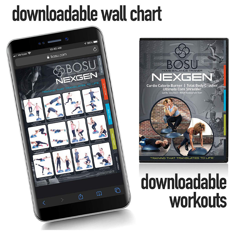 The Bosu balance trainer is perfect for home use and features a latex-free, burst-resistant material that will last for years to come. Holds up to 300 pounds (136 kg), with the included hand pump and downloadable DVD workout set you will be working out in no time!