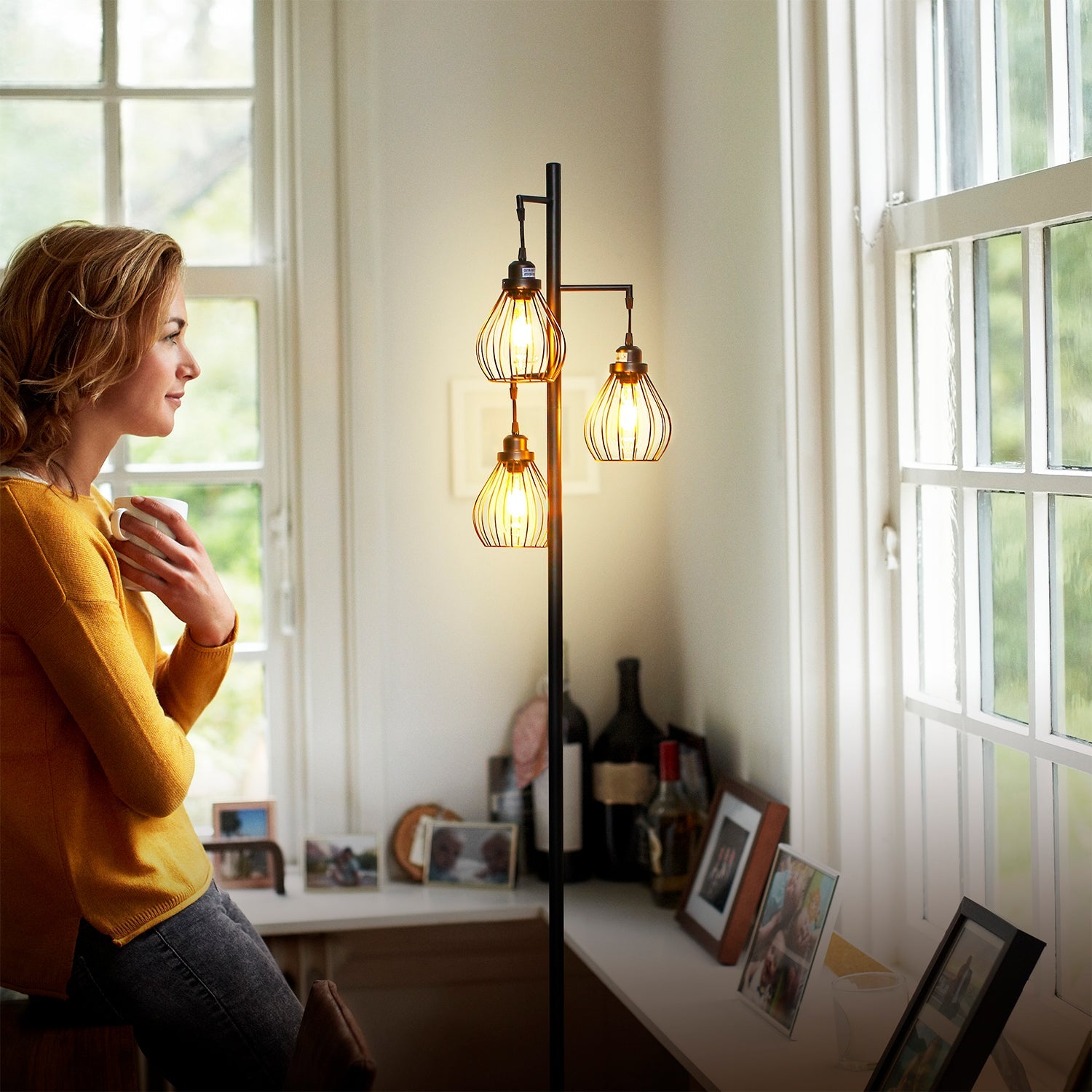 Brightech Teardrop Standing Floor LED Light Lamp Pole with 3 Cage Heads, Black