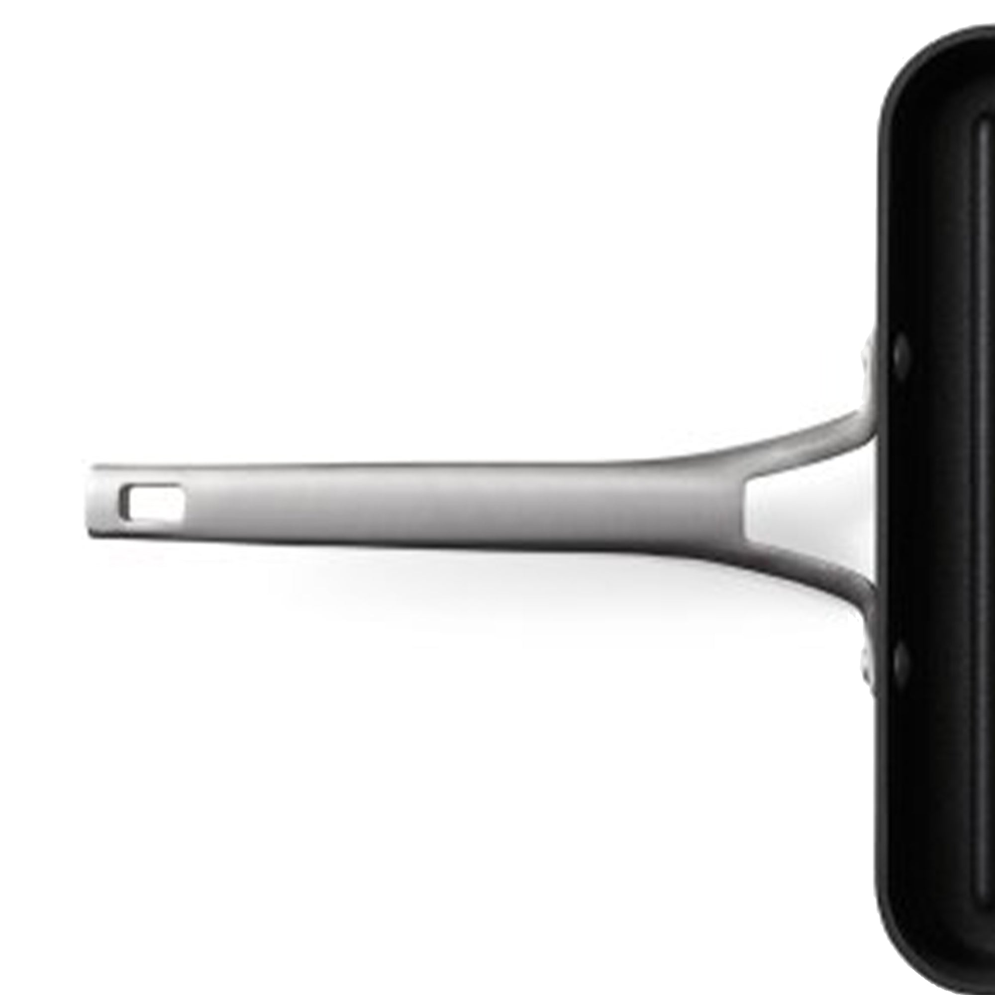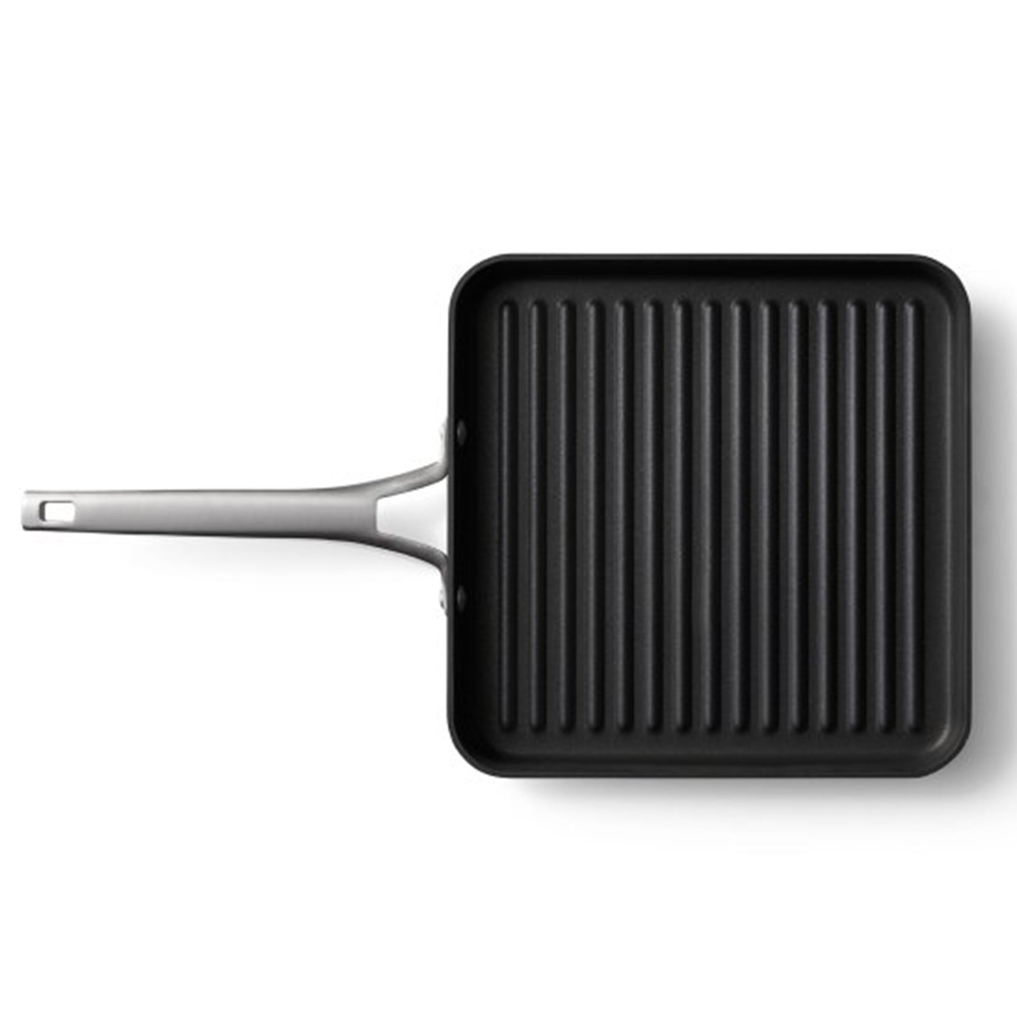 Made with a hard-anodized aluminum exterior and a triple-layer nonstick interior, this grill pan ensures even heat distribution and effortless food release. The 11-inch square surface provides ample cooking space for various foods, from vegetables to meat.