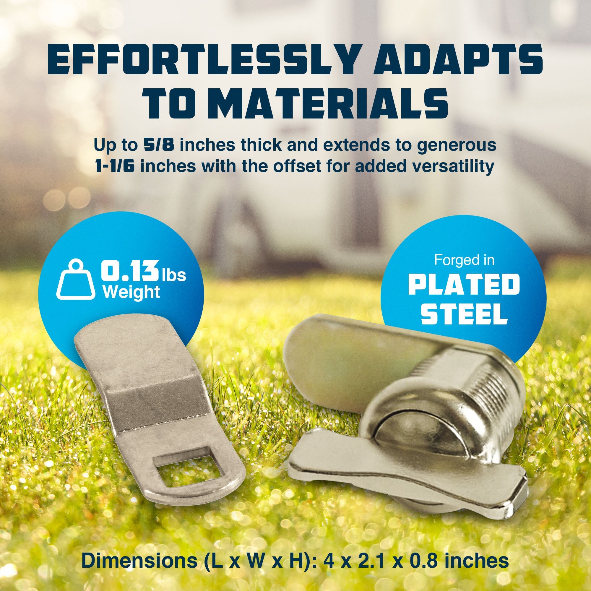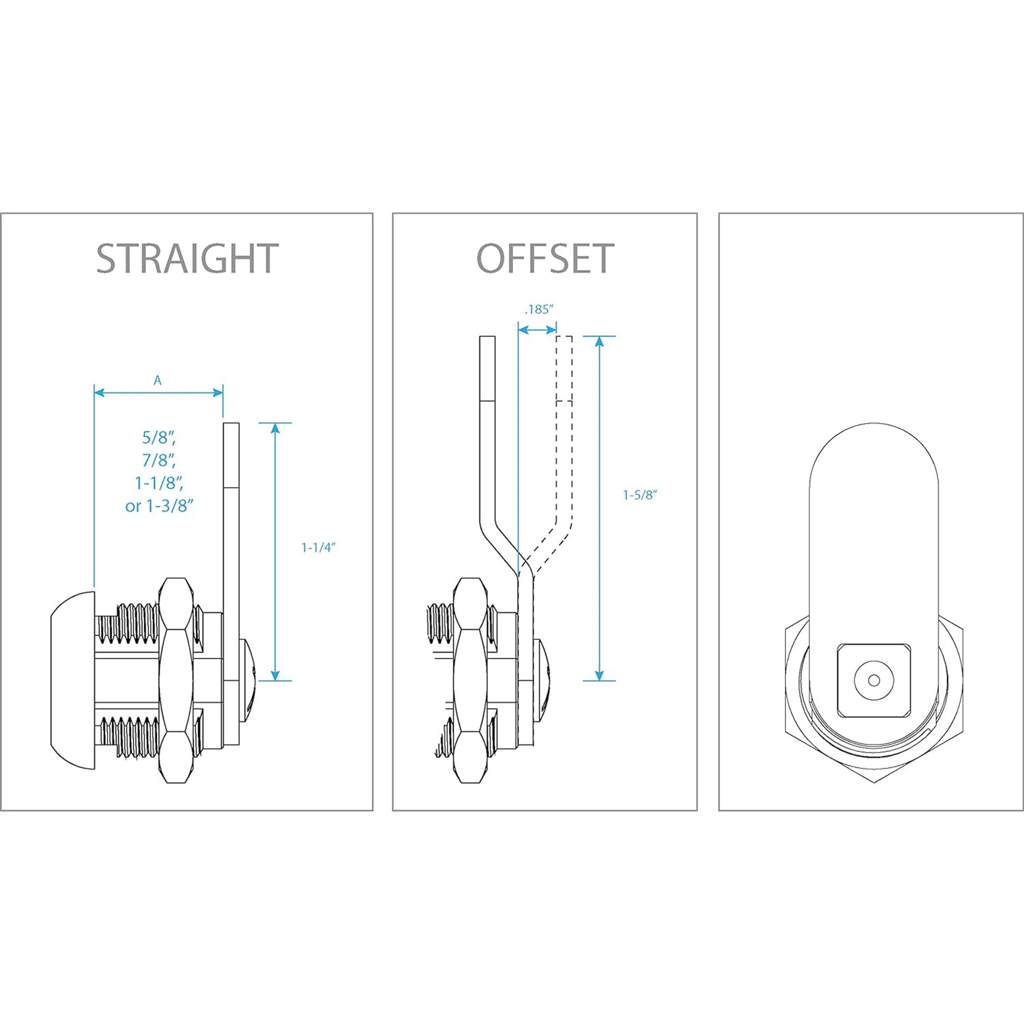 Made from strong plated steel, this cam lock is built to last and can handle tough conditions, making it a highly reliable choice for security needs. This ingenious locking mechanism transcends its purpose, serving as the quintessential solution for novel installations and seamless replacements across the expanse of RVs, cabinets, and diverse storage situations. Unparalleled in its adaptability, it can fit materials up to 5/8 inches thick, but it can extend to an impressive 1-1/6 inches with the offset. If you prefer simplicity, it can also securely lock at the standard 5/8-inch level, giving you great flexibility.