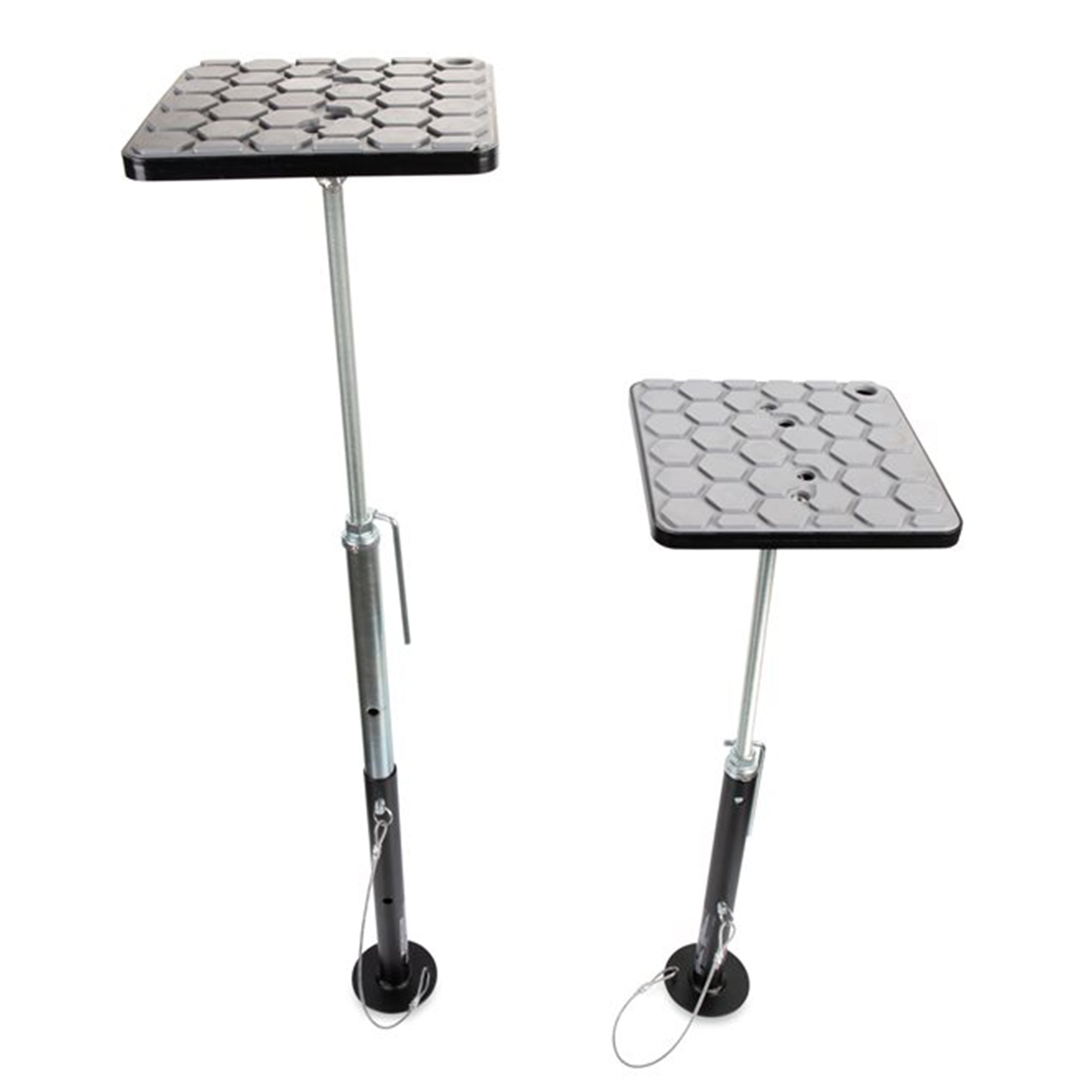Compatible with toy hauler backdoors that convert to patios and RVs with flat-bottom slide-outs, these metal stands each support 1,000 pounds and are a game-changer for your RV patio or awning area. Crafted with durability in mind, the supports are made from powder-coated steel to withstand the rigors of outdoor use. Their adjustable design allows for easy customization, accommodating different heights and uneven terrain effortlessly. With this RV accessory, you can say goodbye to wobbly tables, chairs, and unsteady awnings. Create a secure and enjoyable outdoor hangout space where you can relax, entertain, and make lasting memories with family and friends. Easy to set up and take down, these patio supports are a must-have accessory for RV enthusiasts looking to maximize their outdoor experience.