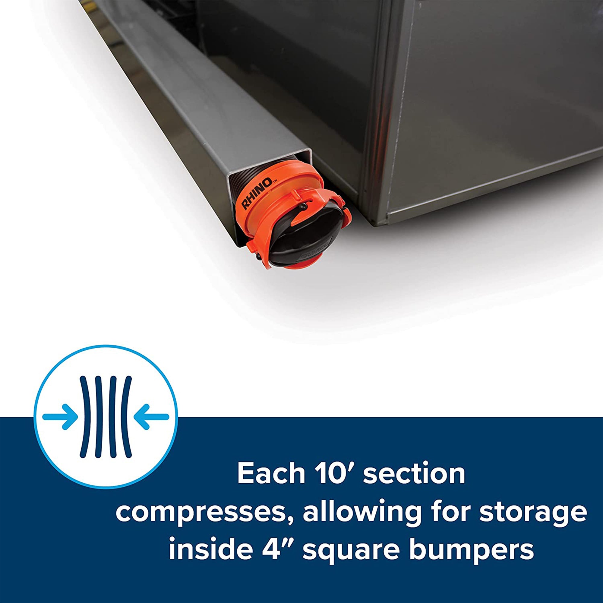 Featuring bayonet fittings with 4 prongs provides a more secure fit. The fittings are permanently attached to the hose for a no-leak experience. A transparent elbow with an easily detachable 4-in-1 adapter can connect to a 3-inch slip or 3-inch, 3.5-inch, and 4-inch sewer hose end. The hose assemblies compress for storage, and the 4-in-1 adapter is removable to store the hose ins standard 4-inch square bumpers.