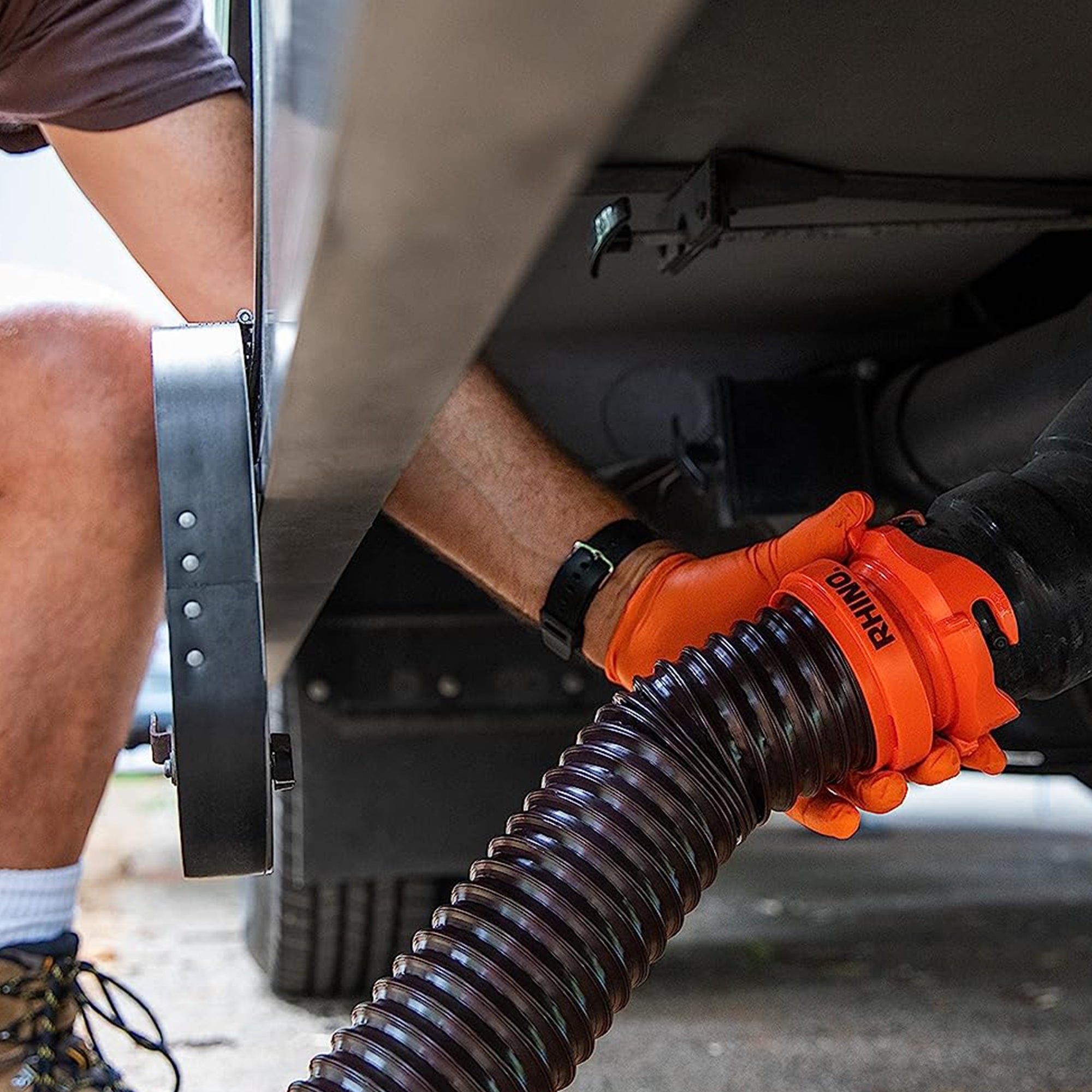 The sewer hose kit with RhinoFLEX hose and swivel fittings is a ready-to-use kit made with the toughest hose. The 2 hoses are made of sturdy polyolefin and are reinforced with steel wire with collapsible features, so you only have to extend as much hose as you need.