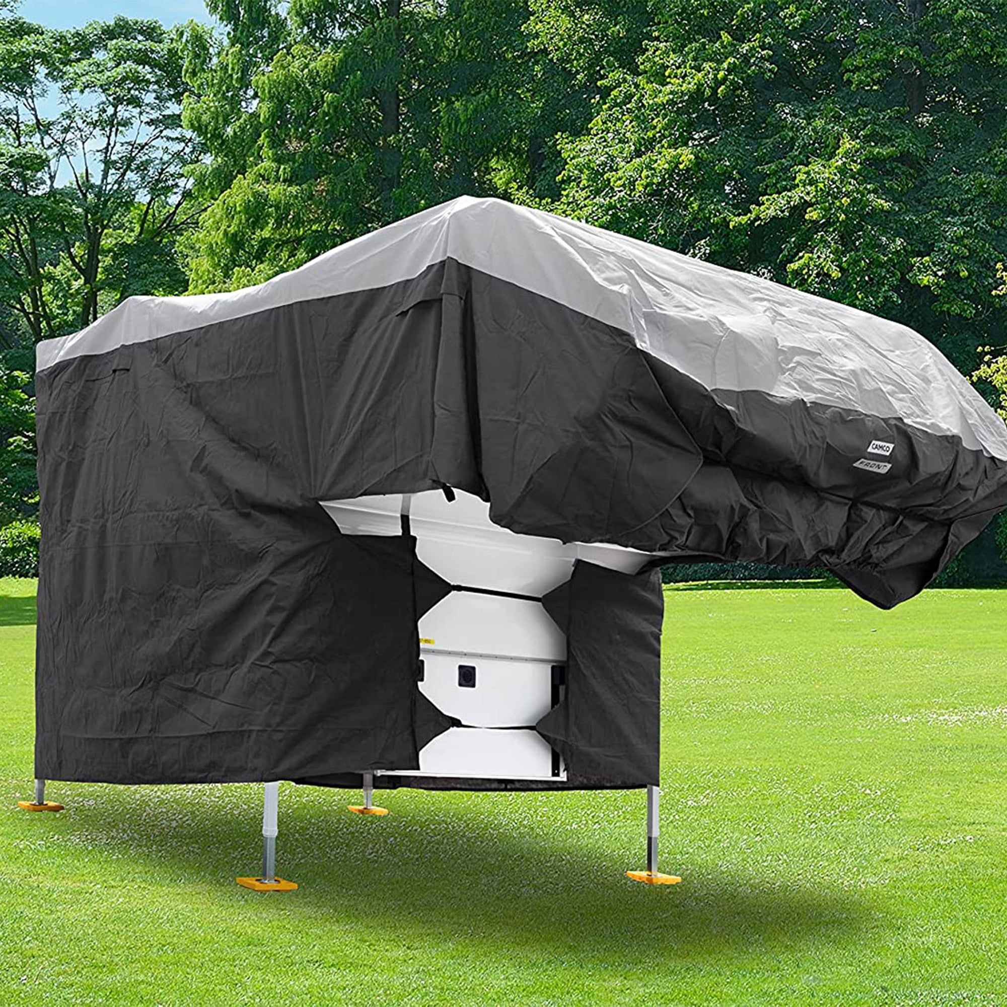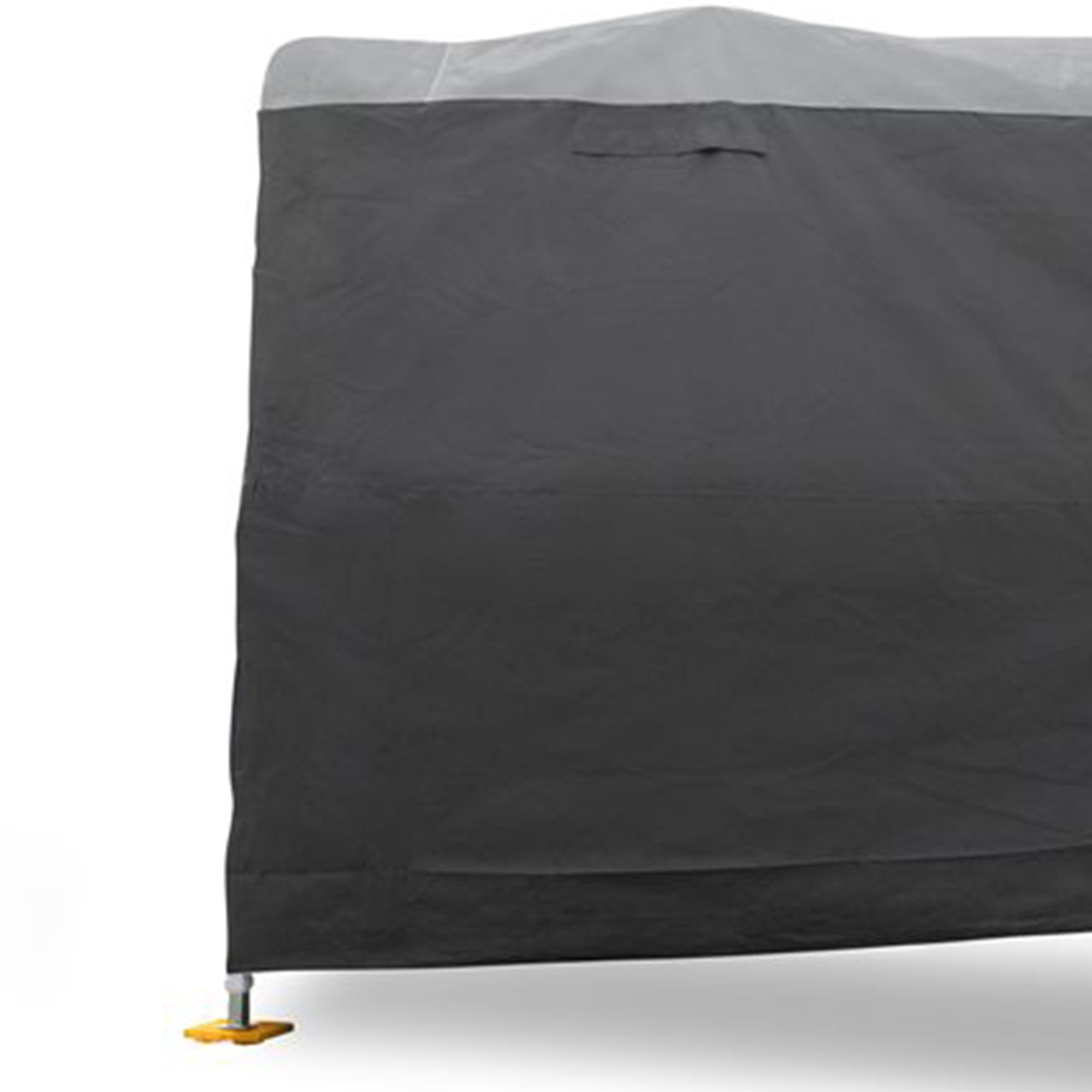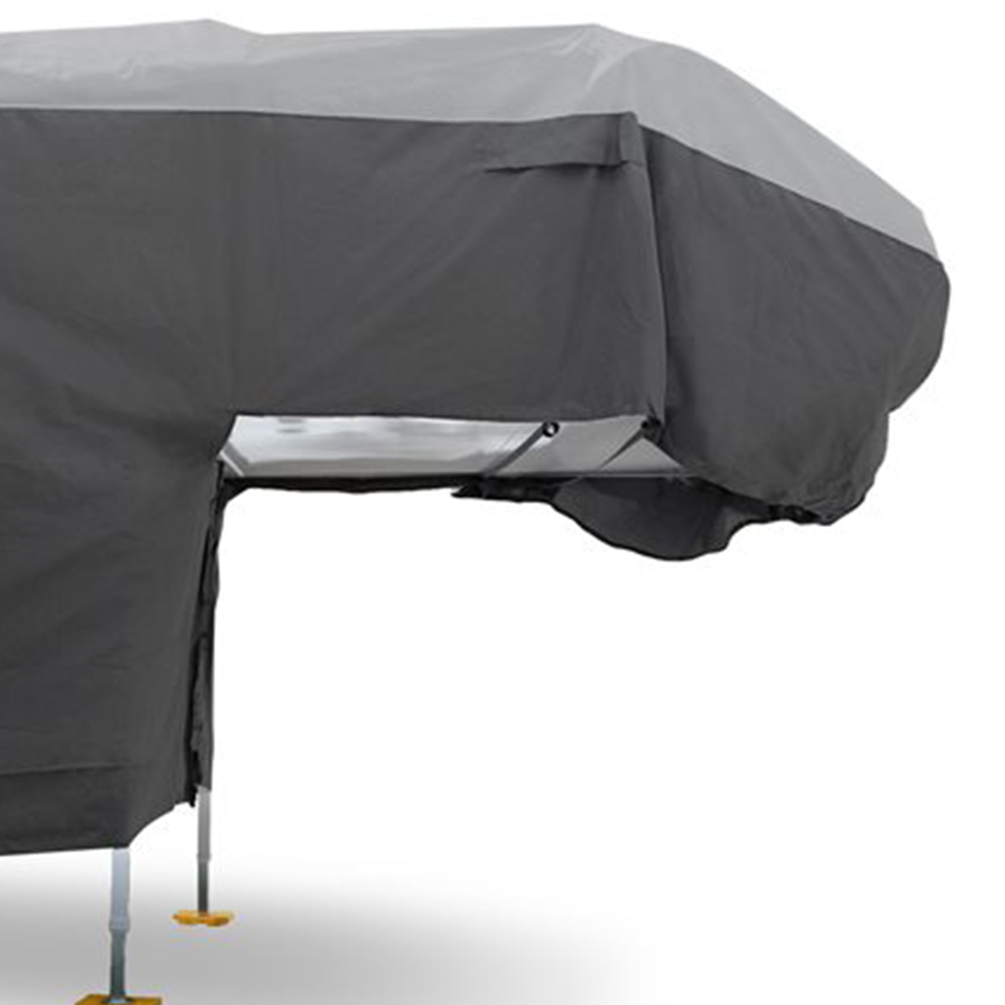 Measuring 236 inches long, 108 inches tall, and 106 inches wide, this cover is designed to fit most 17-foot, 6-inch to 19-foot, 6-inch-long slide-in campers. The top of the cover is made of a 3-layer material, while the sides are made of 2 layers of spun-bond polypropylene for increased durability. With a breathable design, this cover is sure to protect your camper against unexpected heat, rain, sleet, or snow elements.