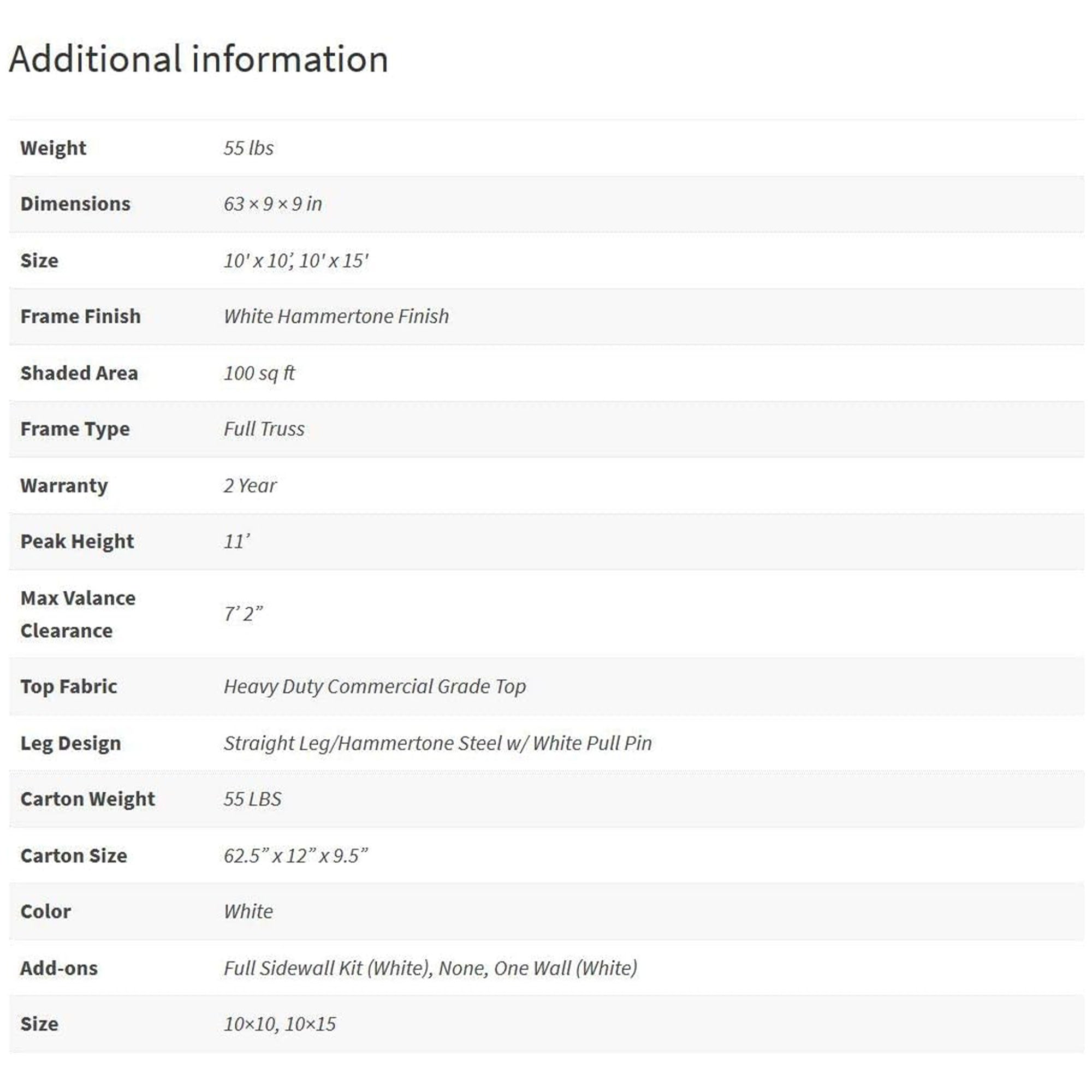 - Full truss system helps keep canopy upright and stable