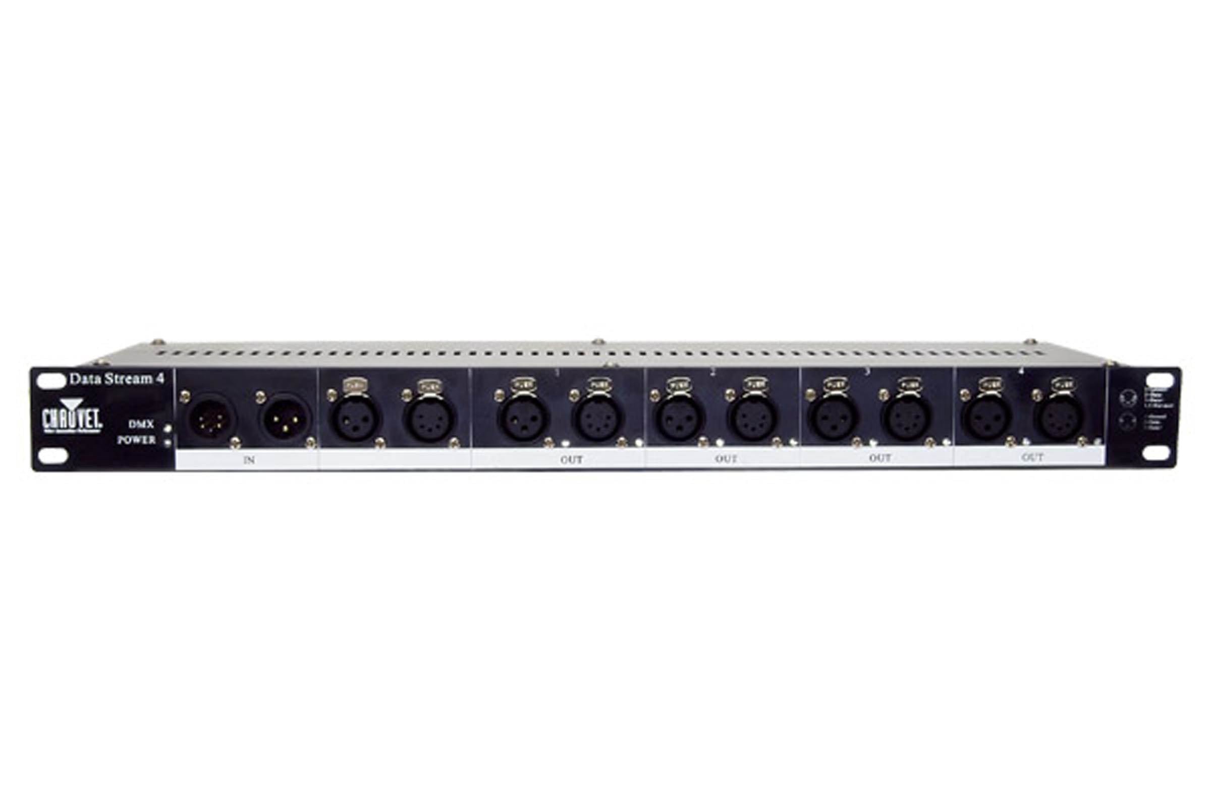 The **Chauvet Data Stream 4** is a universal DMX-512 optical splitter designed to distribute the incoming DMX signal, in daisy chain configurations, into four separate outputs with an additional “thru” port.