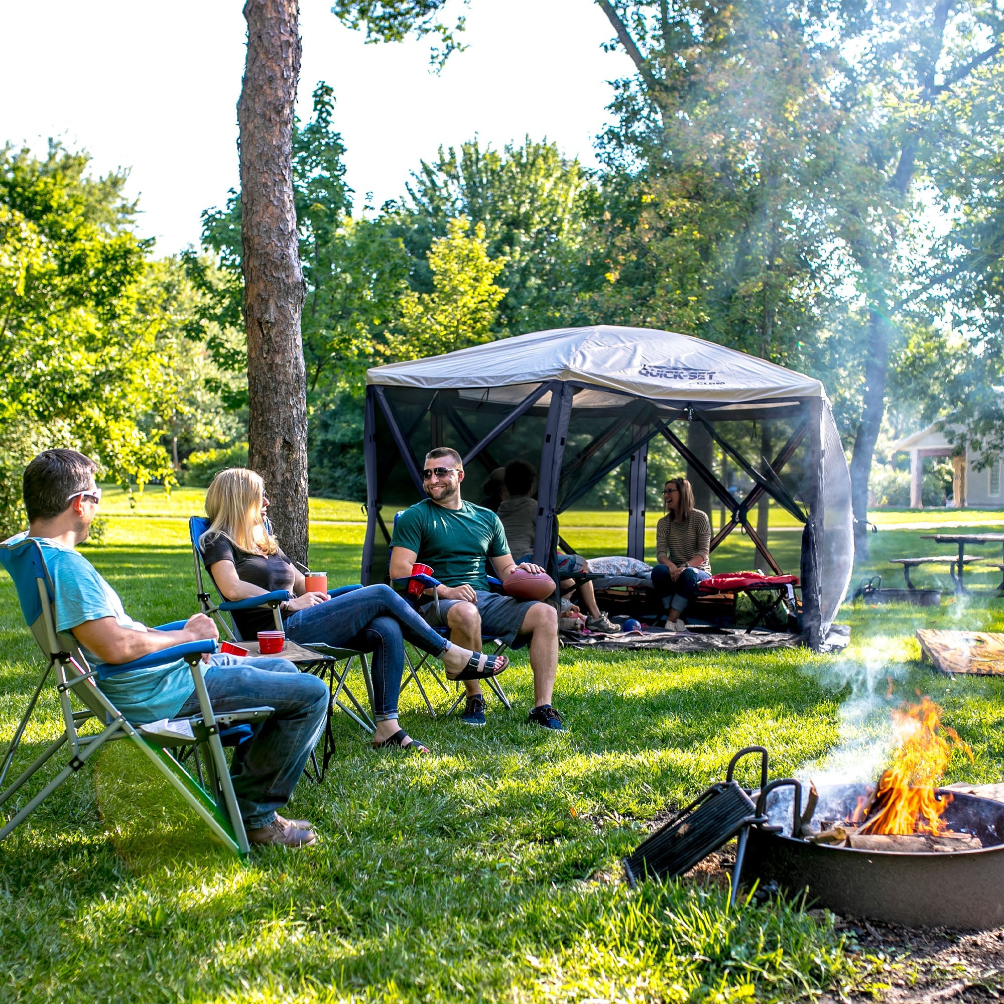 This 6-sided outdoor tent accommodates up to 8 people and features a no-see-um mesh screen, an extra-wide skirt, and a taped roof panel that resists water to keep you dry. Whether you're lounging with friends or dining at a picnic table, this gazebo canopy provides a haven from sun, rain, and wind.