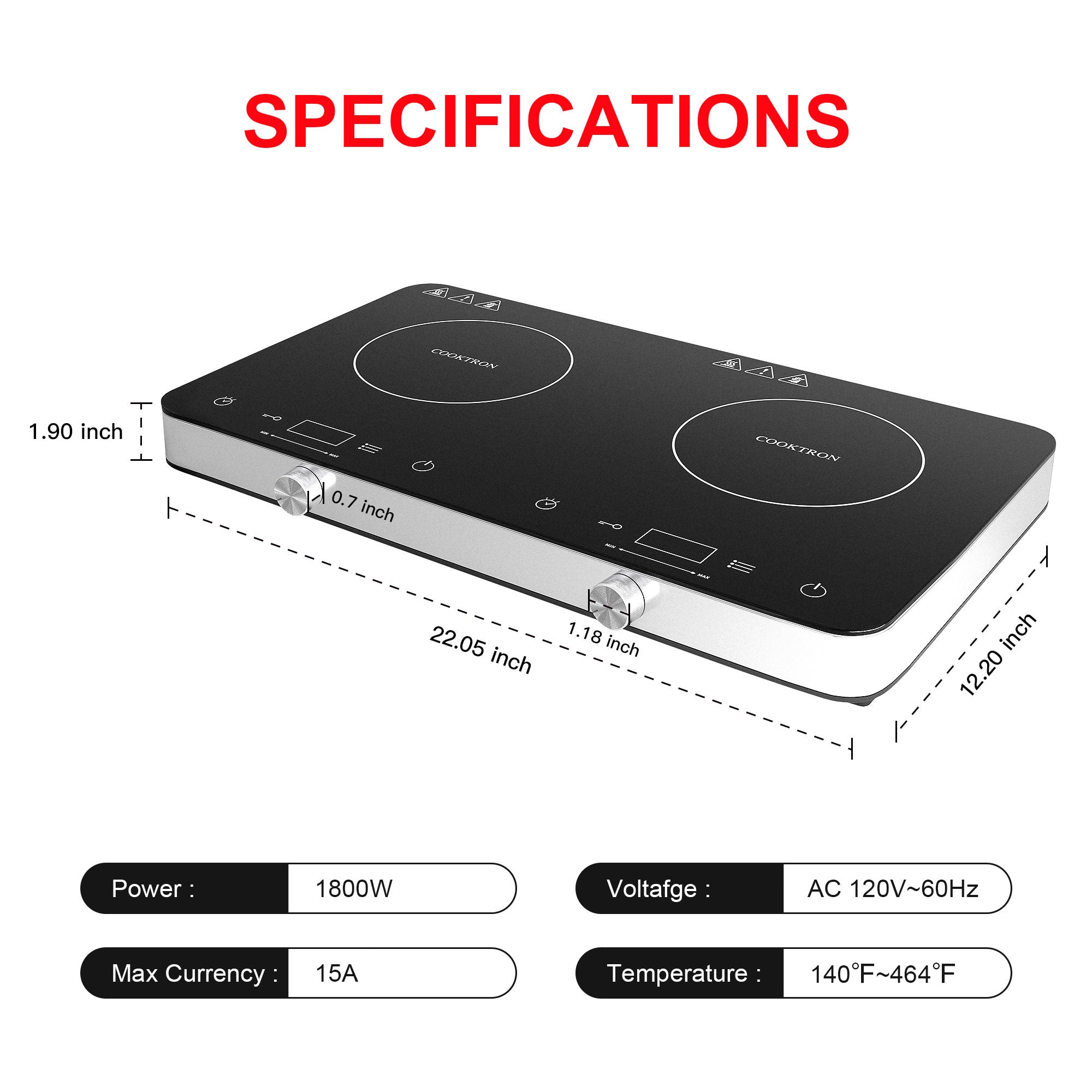 - Double induction cooktop delivers even heating; 9 powers, ranging from 200 to 1800 watts, and 10 temperature controls ranging from 140 to 464 degrees Fahrenheit