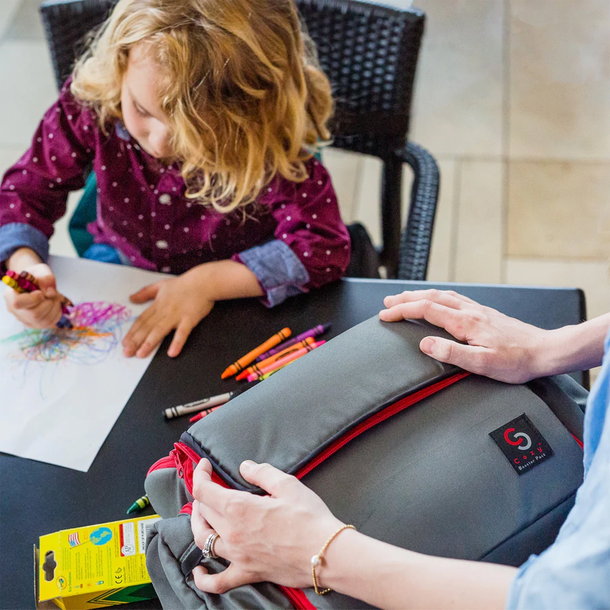 • This backpack has been designed to be supportive with a 5-point safety harness to hold your child securely when they eat