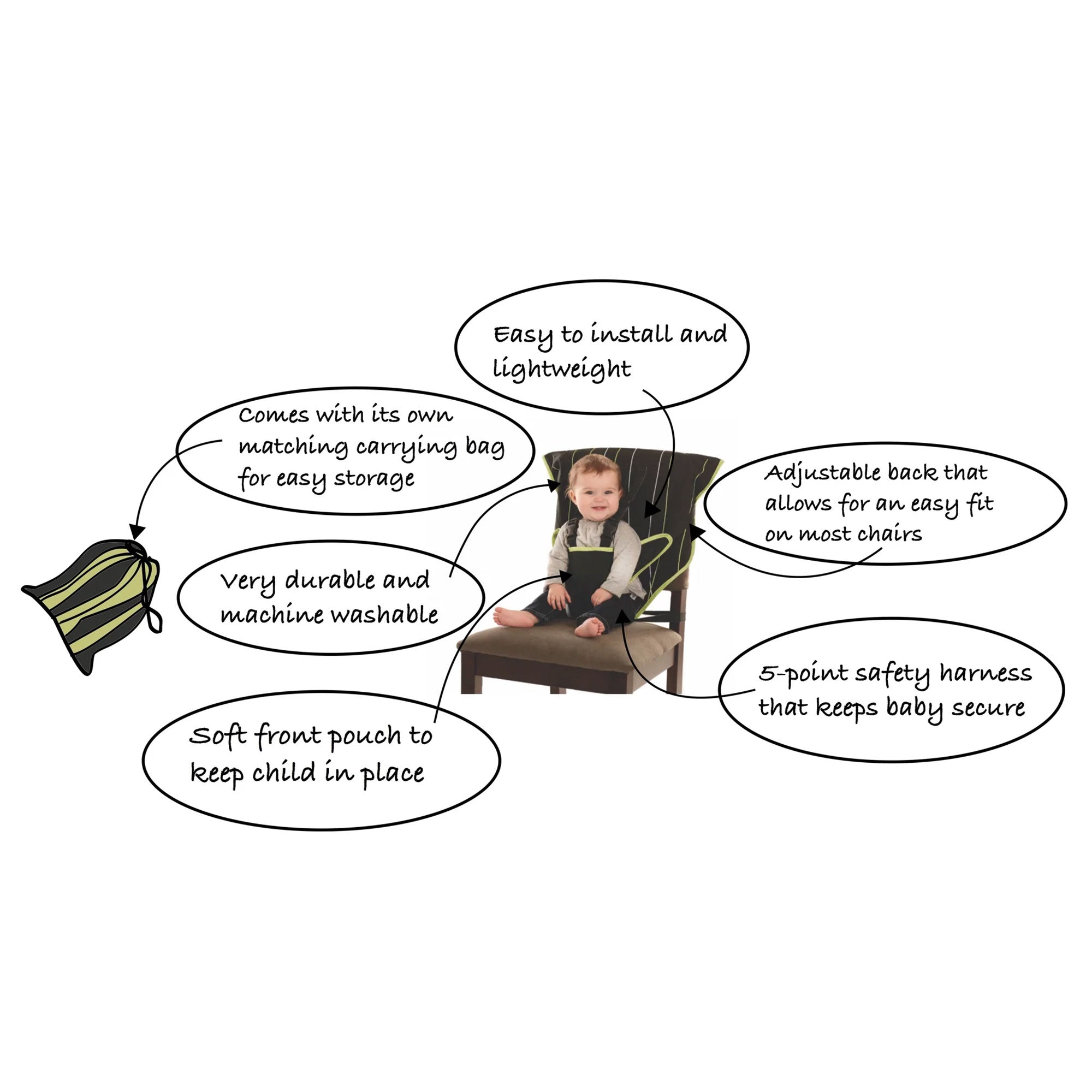 This portable easy seat provides you with an on-the-go high chair. Whether you're heading to a friend's hour or out to dinner, the portable cloth high chair makes feeding time less stressful and more accessible. Fitting over the top of a chair, just attach the straps around the back to secure it with 1 click. The straps join together to ensure the child's safety in the 5-point reinforced harness.