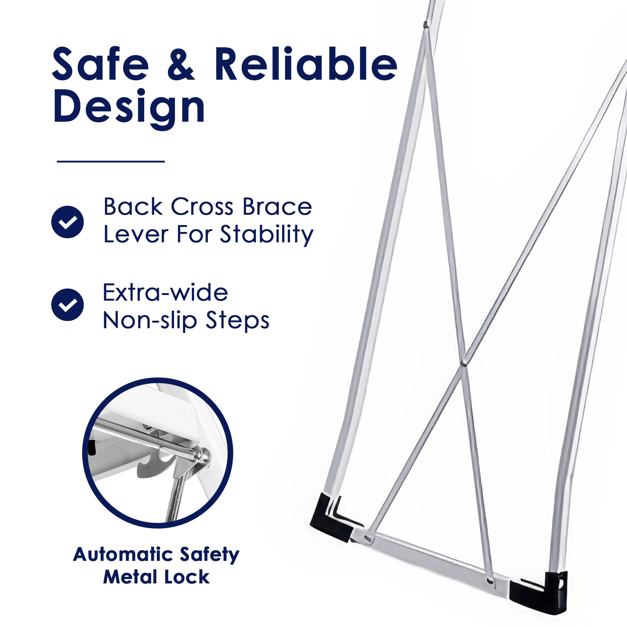 - Automatic safety metal locking mechanism and built-in back cross brace ensure ultimate security whether on step 1 or step 4
