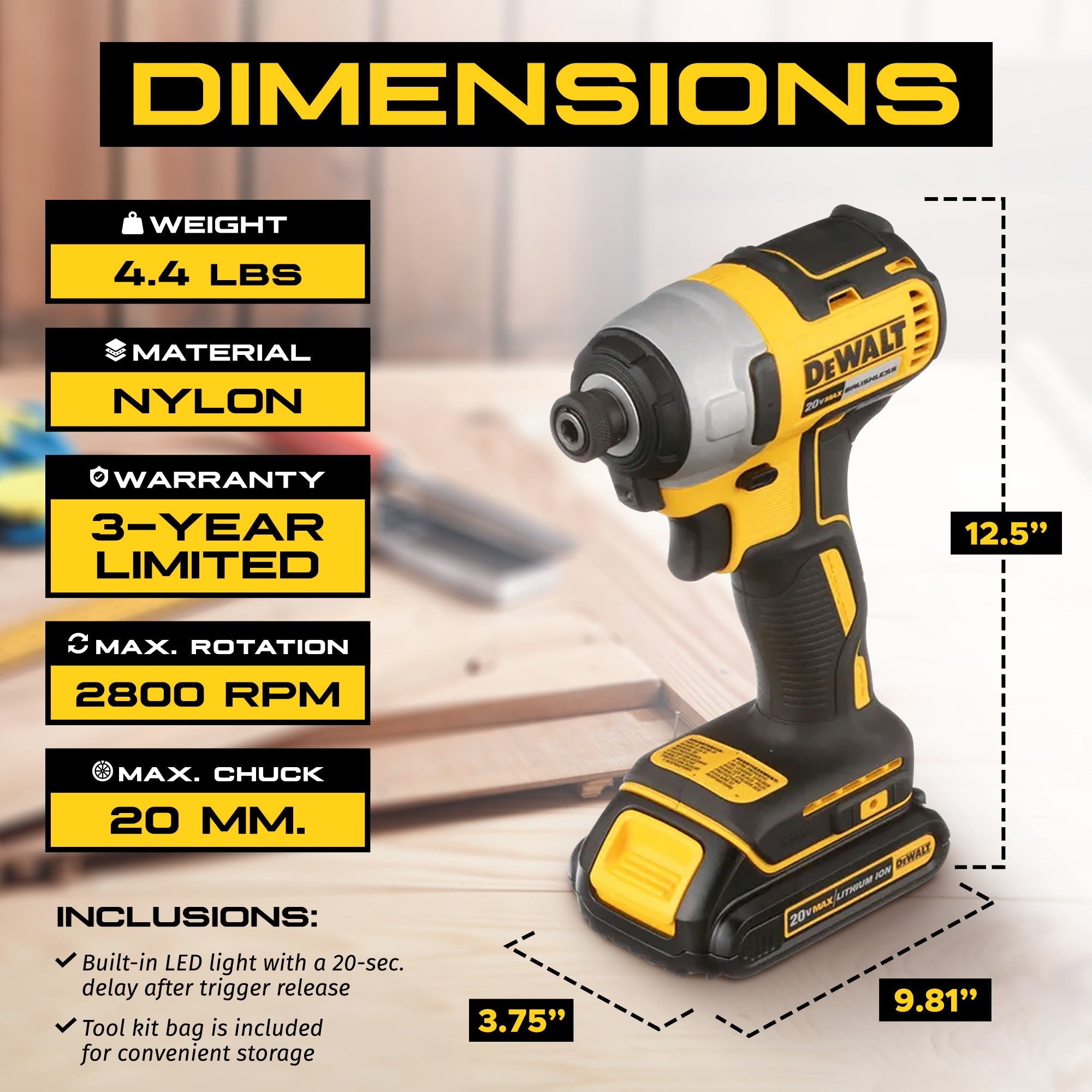 Navigate tight spaces effortlessly with the compact and lightweight design, illuminated by a bright LED output with a 20-second delay after trigger release, and giving you the ability to see in tight spaces. Elevate your drill game and experience the 20-volt Brushless Cordless Impact Driver Kit from DeWalt.
