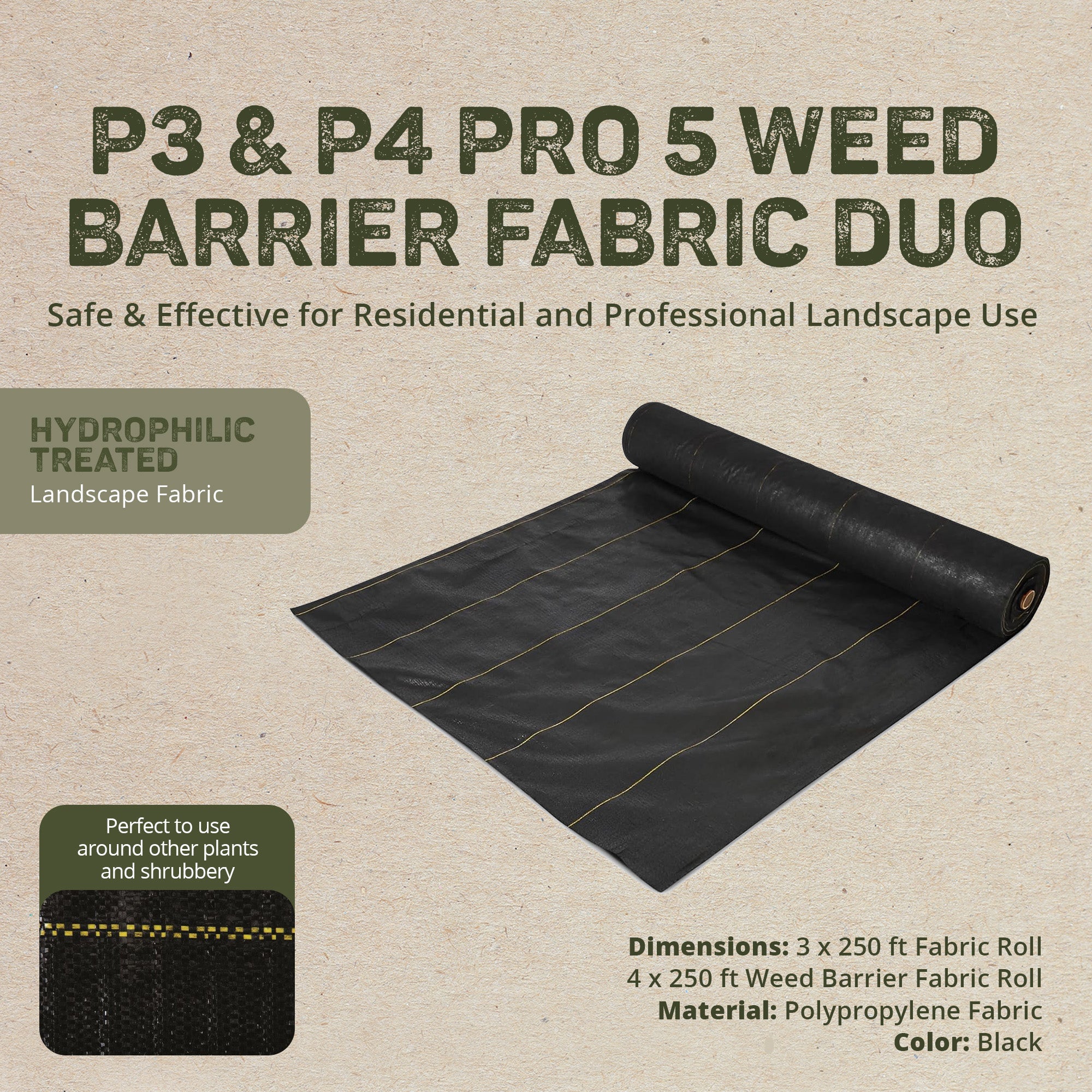 The Pro-5 Weed-Barrier Garden Ground Cover is the industry’s best 5 ounce woven landscaping fabric. With a needle-punched, polypropylene fabric that holds up through wind, weather, and wear from heavy piles of mulch, this heavy-duty landscape cover is designed for professional and commercial use. Comes with one 3x250 ft fabric roll and one 4x250ft weed barrier fabric roll.