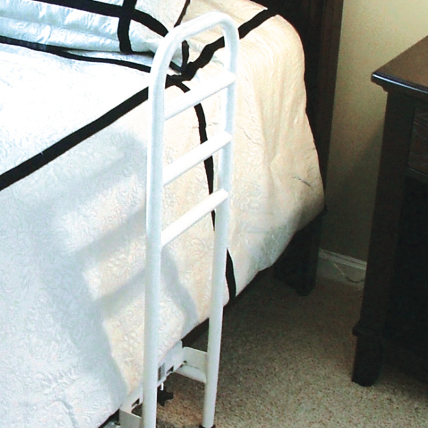 This elderly bed rail assist is perfect for nursing homes, hospices, and at home. Its unique design is intended to attach to most Hollywood bed frames up to 11-inches wide and needs no tools for installation. The 8-inch mounting bracket attaches directly to the frame, allowing the steel tube
