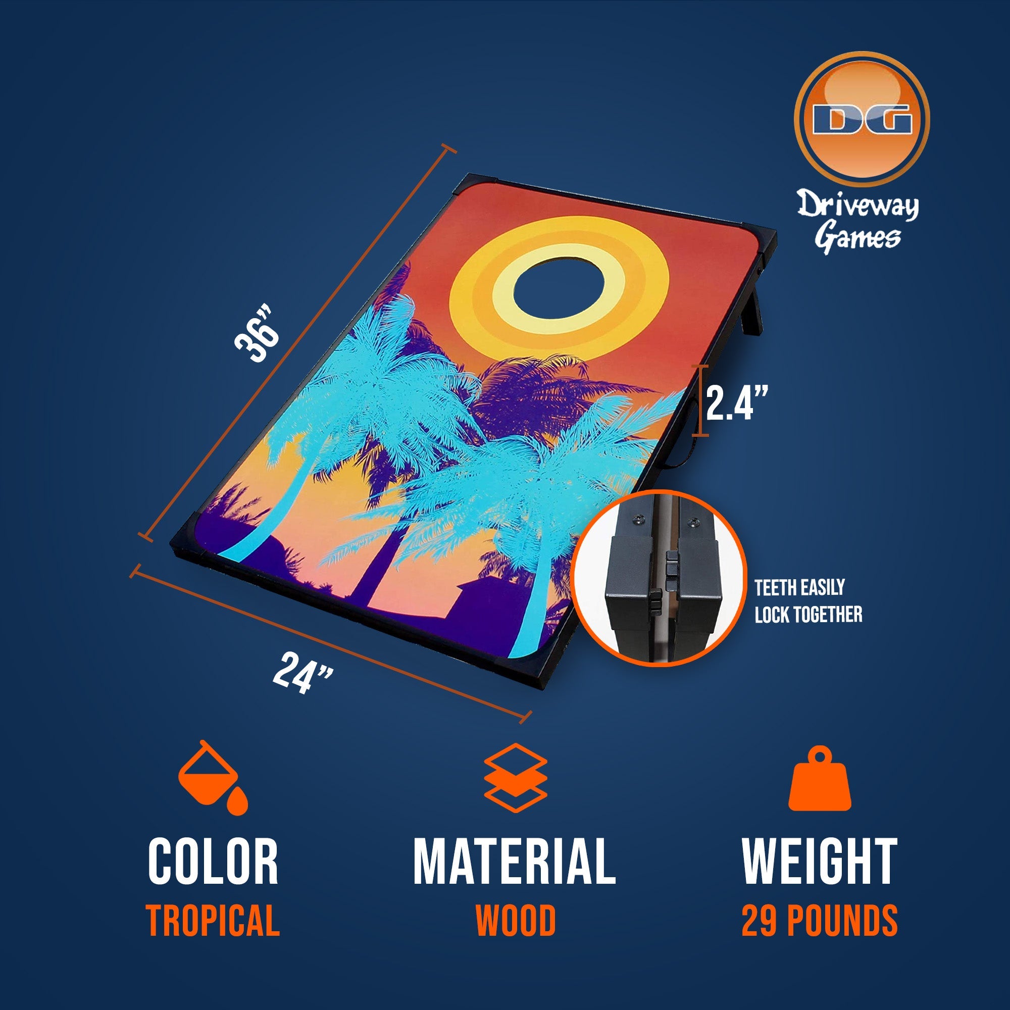 Make your next outdoor gathering a tropical paradise with the Driveway Games Bean Bag Toss Cornhole Set. Perfect for backyard barbecues, beach parties, and tailgates, this game set will be a hit with friends and family. With regulation-sized cornhole boards, all-weather bean bags, and cornhole rules, this game set is ready to use right away.