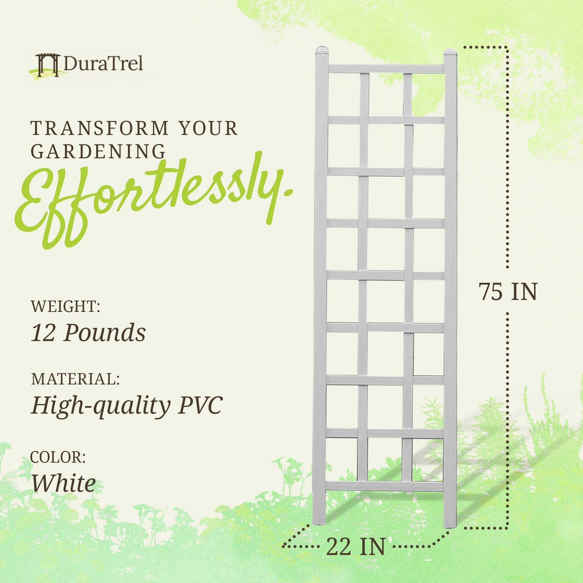 Complete your garden or plant room environment with the Dura-Trel Providence 22 x 75-inch Lattice Trellis. Elevate your gardening experience with this high-quality, low-maintenance trellis that lets your greenery take center stage.