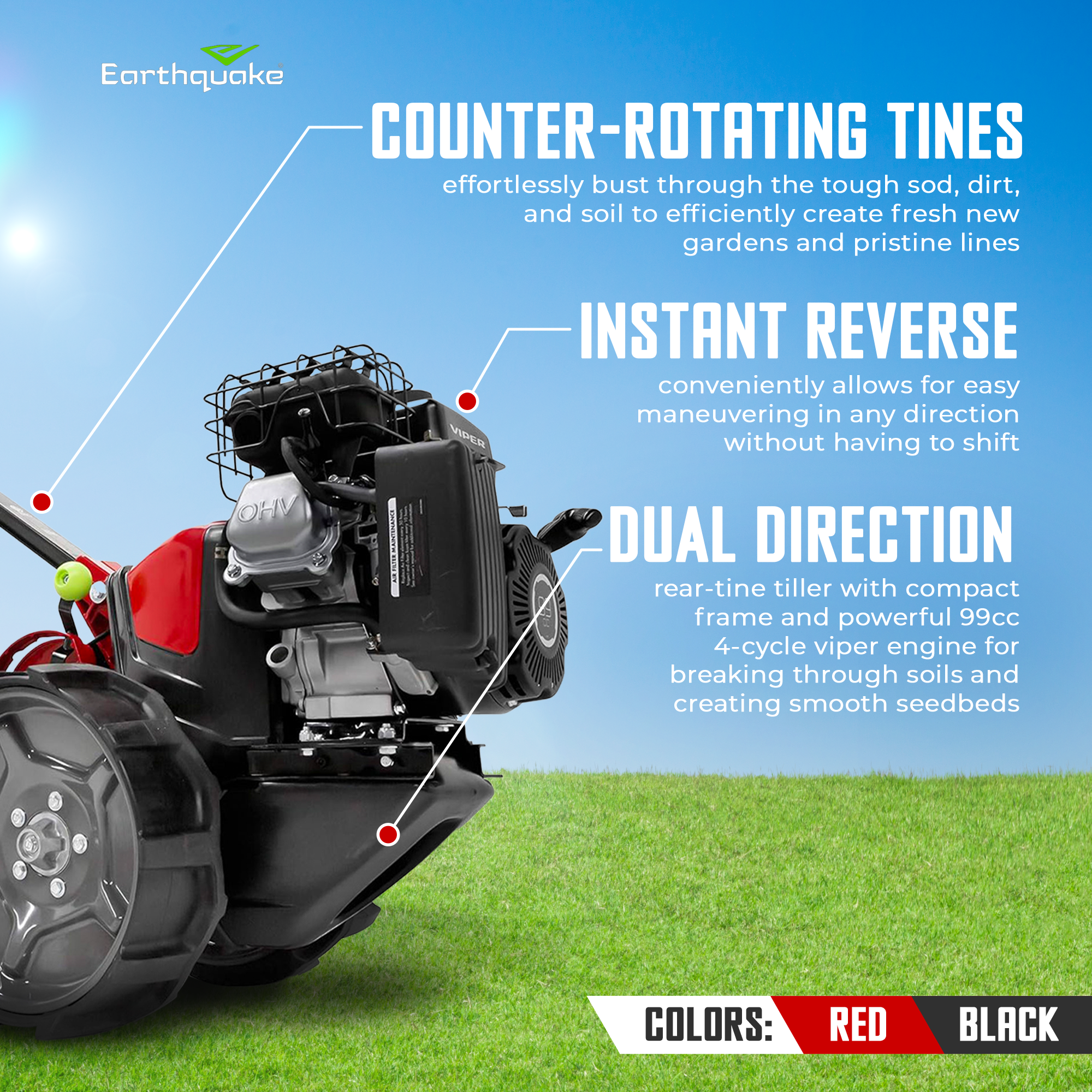 - Dual direction rear-tine tiller with compact frame and powerful 99cc 4-cycle viper engine for breaking through soils and creating smooth seedbeds