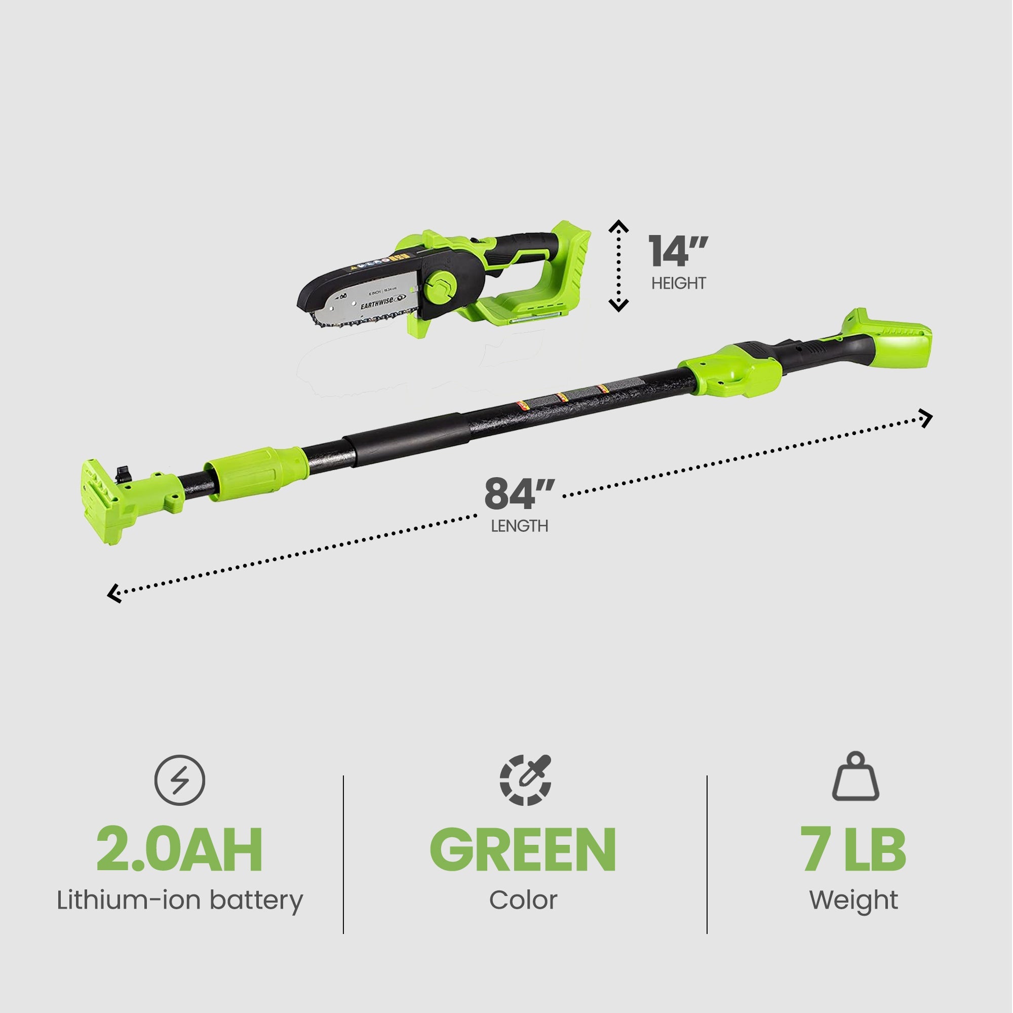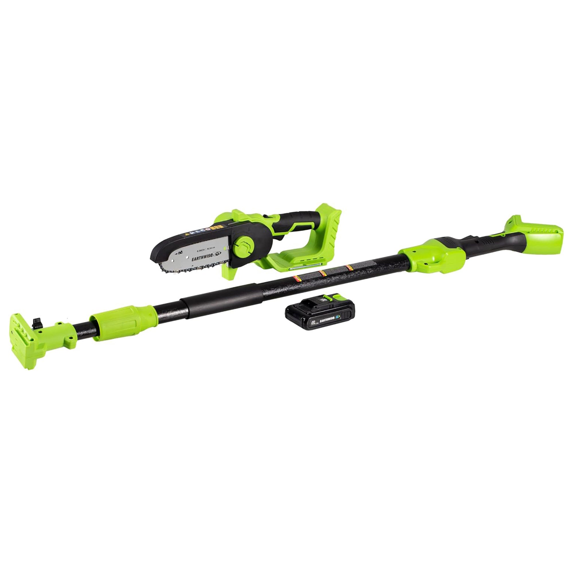 Powered by a robust 20-volt brush motor and a 20-volt 2.0Ah lithium-ion battery, this tool delivers reliable performance and extended run time. The fast charger ensures your chainsaw is always ready for action. The battery is compatible with other Earthwise 20-volt products, offering versatility and convenience. This mini pole saw features a 6-inch tri-link bar and chain, perfect for precise and efficient cutting. Safety is a priority, with a protective blade and chain cover included for secure storage. Lightweight and ergonomically designed, this electric pole saw is easy to handle, making tree trimming a comfortable task. The extension pole extends up to 7 feet, allowing you to reach high branches without needing a ladder. This design simplifies your work and enhances safety by keeping you grounded while cutting hard-to-reach limbs.