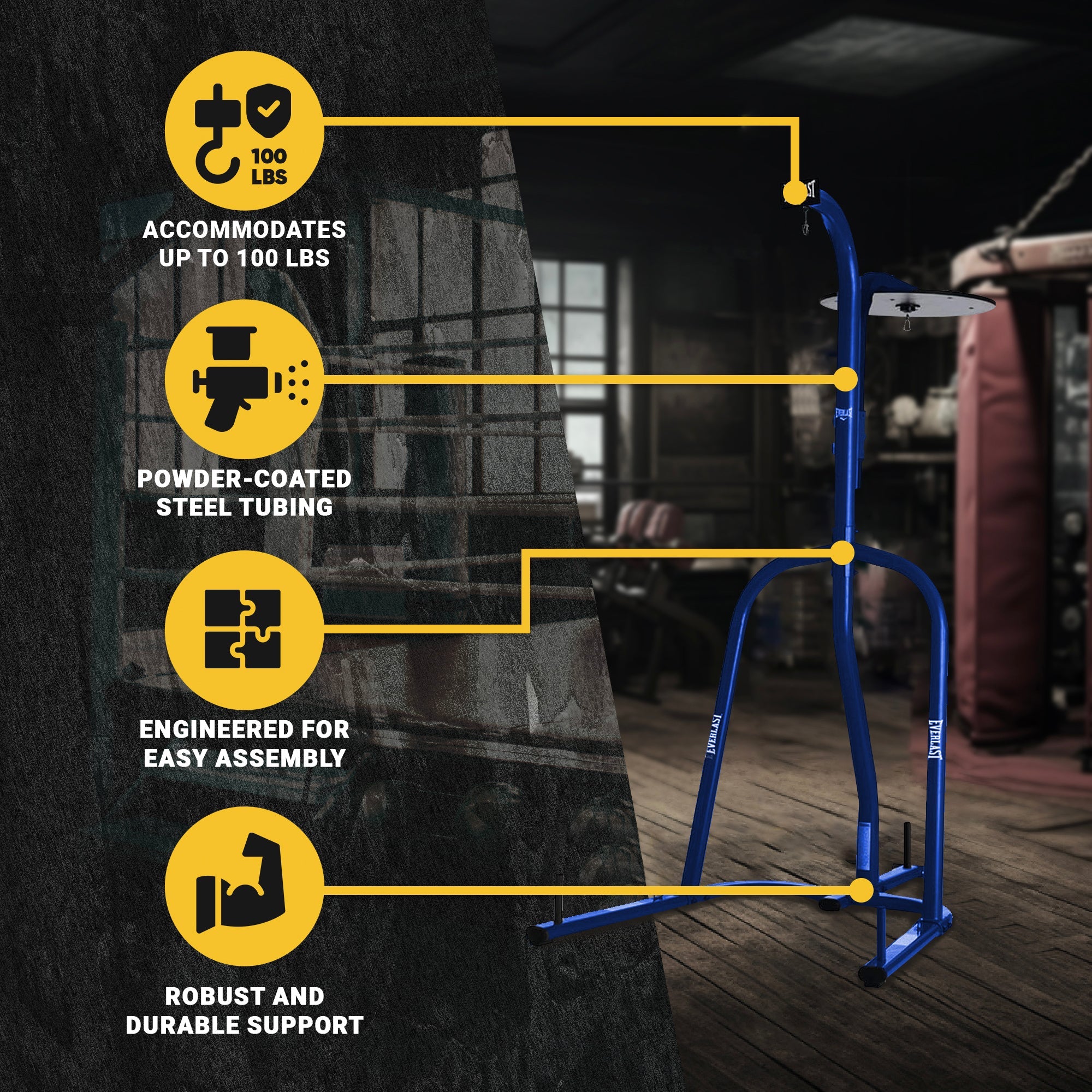 Enjoy a high-intensity workout thanks to the strong and durable support of the Everlast Dual Powder Coated Steel 100-Pound Punching and Speed Bag Stand.