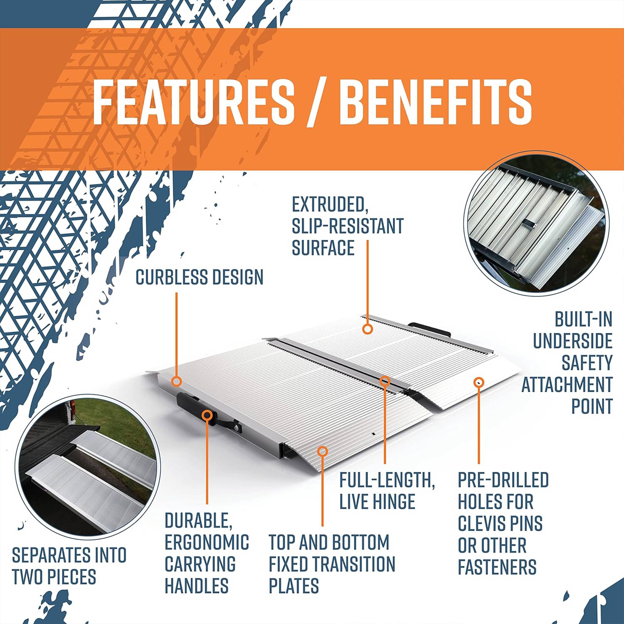- Easily foldable to a compact 15.48-inch width and can be conveniently stowed in a truck, trailer, shed, or van; Durable handles provide a comfortable grip for easy carrying without compromising the ramp's functionality