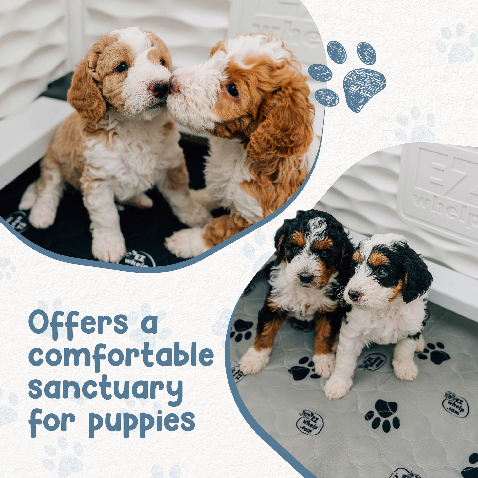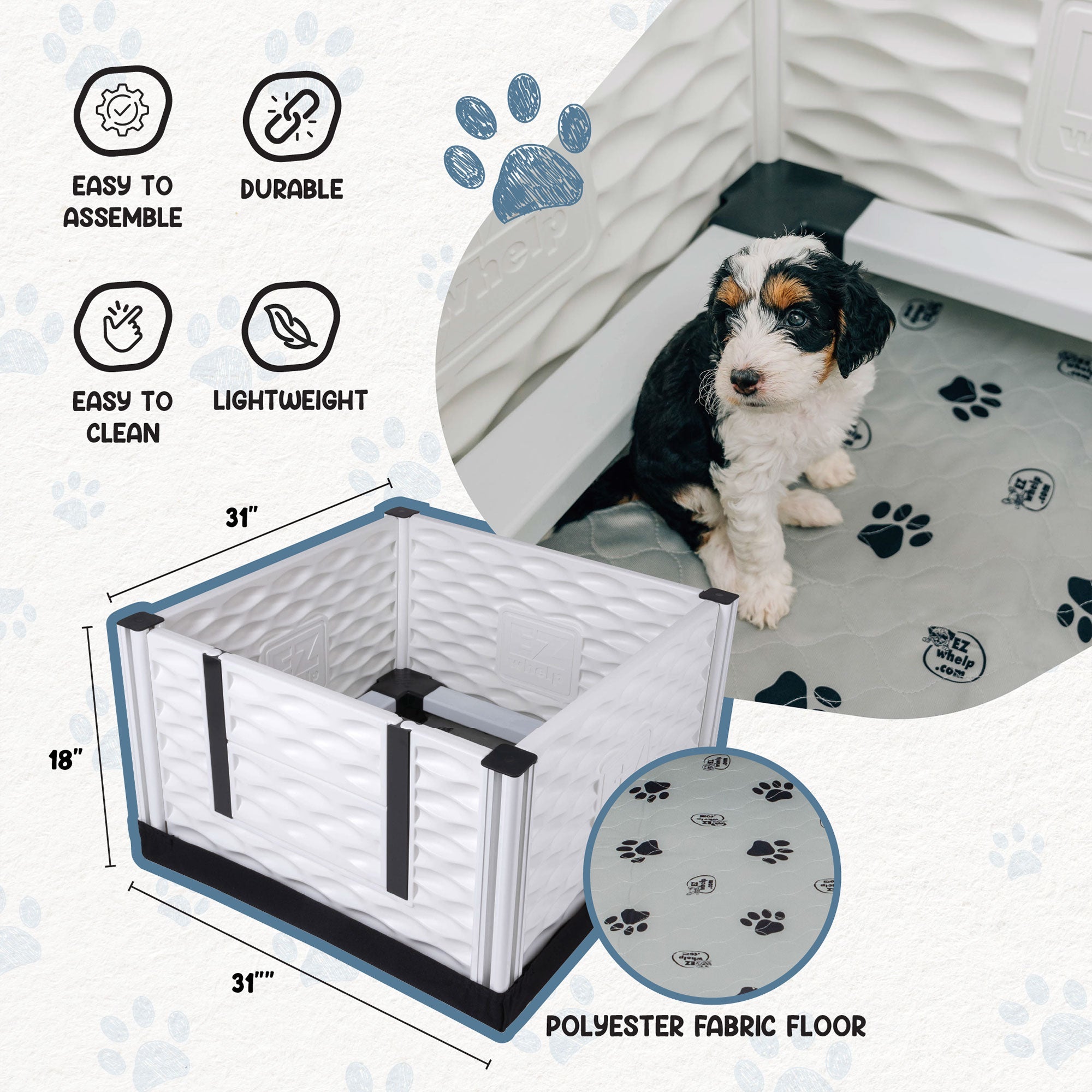 The EZclassic comes with a removable rail assembly that protects puppies from being smothered by their mother and has a front panel with a two-piece door that prevents puppies from escaping. The two-piece door allows you easy access to the puppies. This entrance allows the mother to come and go without feeling trapped. The durable box has a portable design, allowing you to move it from room to room with ease. The whelping box requires no tools to assemble, so setup is quick and easy!