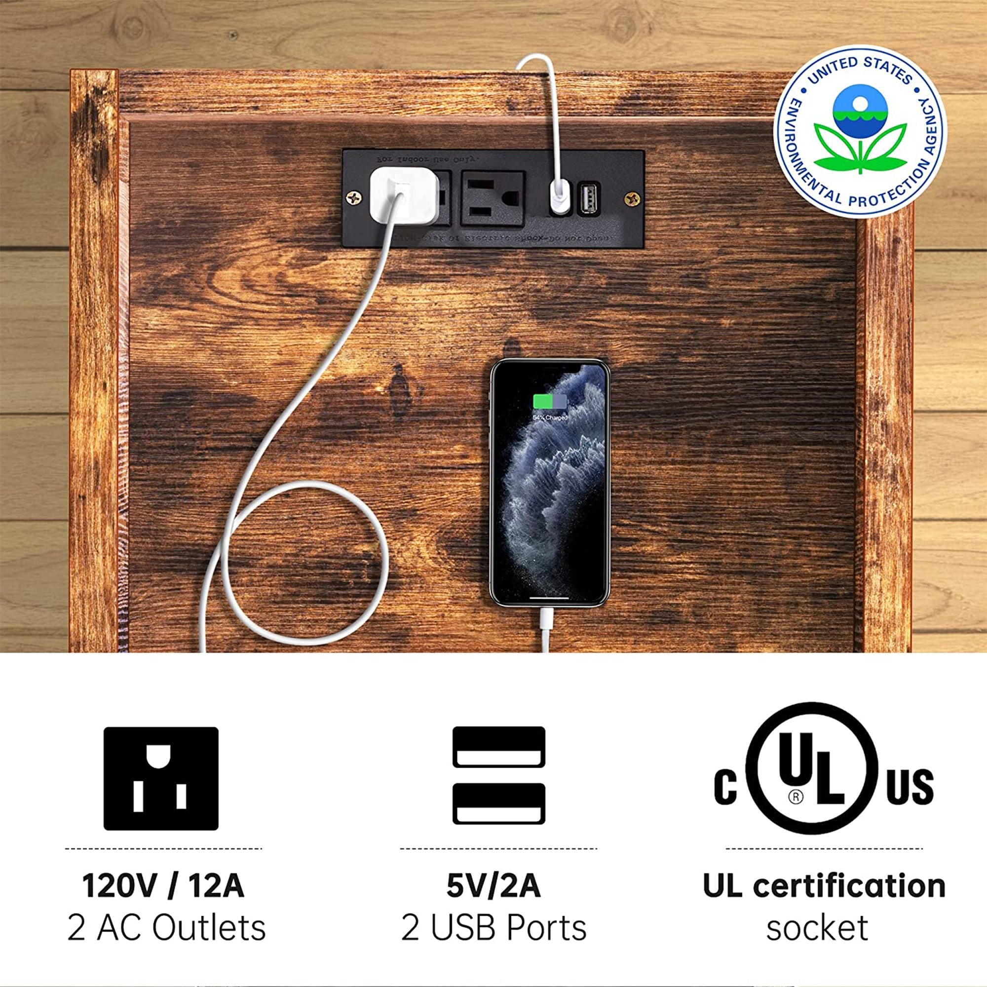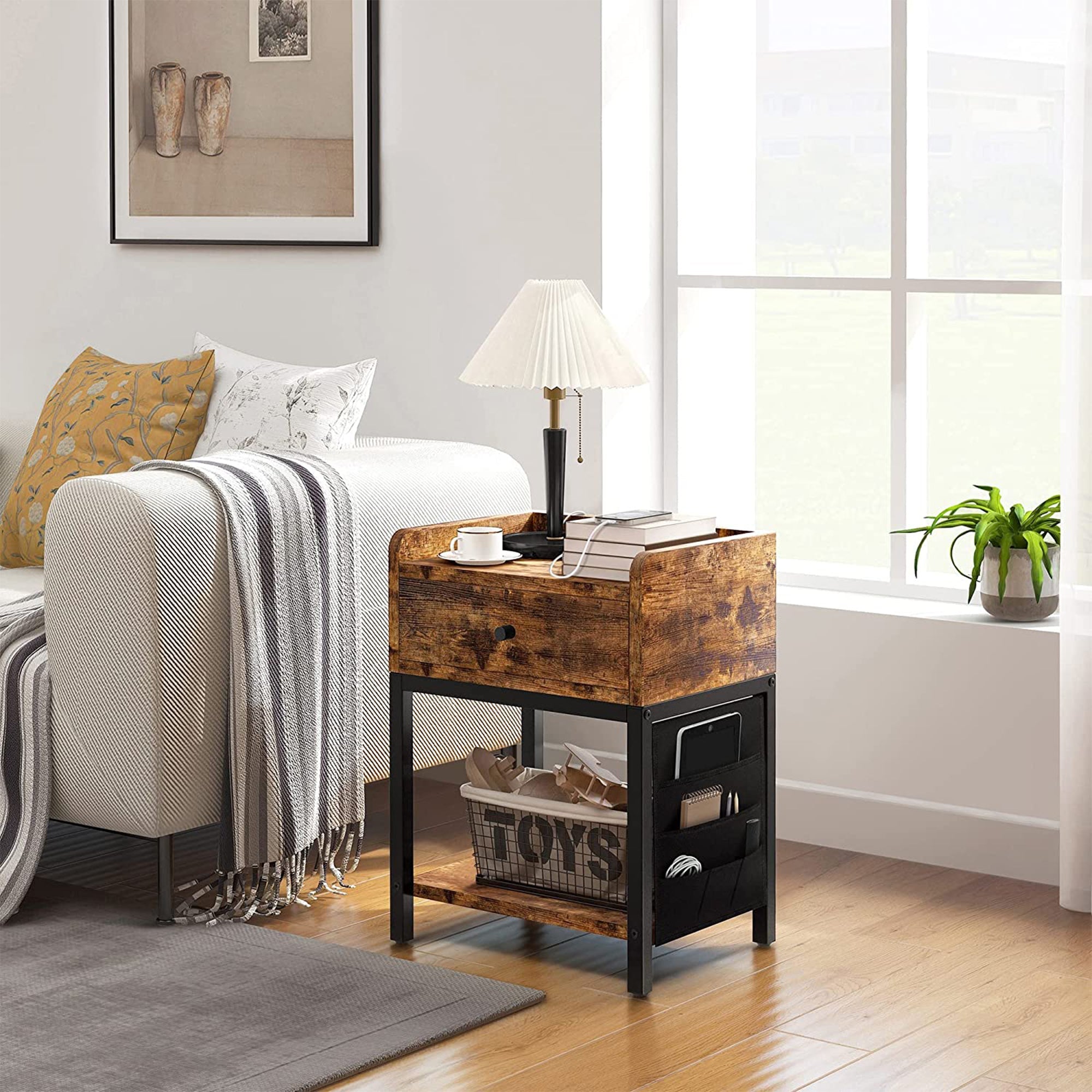 With 2 shelves and 1 drawer, this end table and nightstand unit have enough room for books, electronics, alarm clocks, plants, decor pieces, and more. The durable metal frame and high-quality particle board are EPA certified, so you don't have to worry about what materials you're bringing into your home. Equipped with 2 convenient plug-ins and 2 USB ports with a 6.5-foot power supply cord, you'll be able to plug in multiple devices and electronics all at the same time.