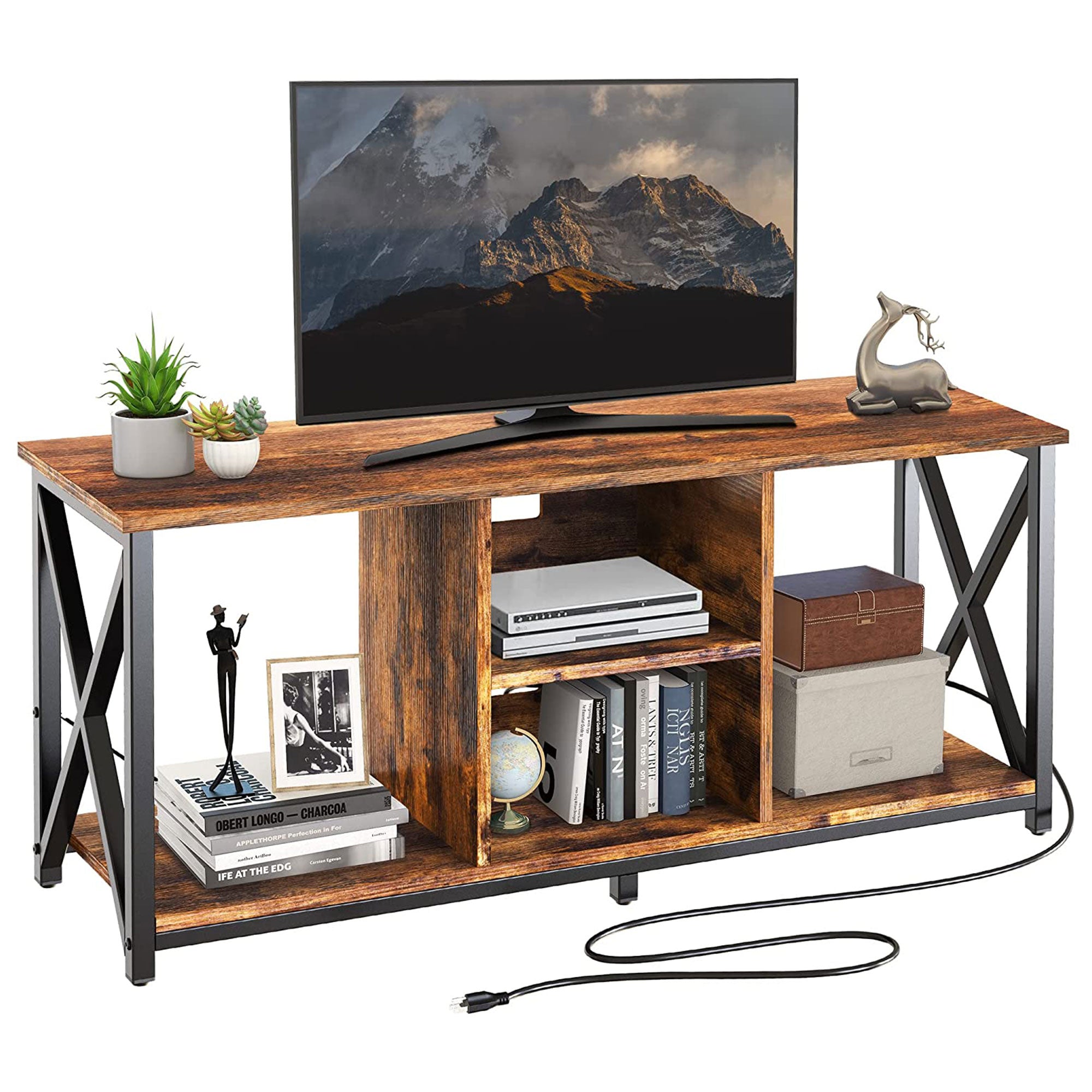 There are 4 standard plug sockets built into the unit, which can power up TVs, media players, WiFi routers, etc. The wire holes in the back can hide messy wires and help keep your things in order. The shelf is made of standard particleboard with melamine coating, which is durable, waterproof, and easy to clean, offering you a safe and healthy living environment. This TV stand can bear up to 200 pounds, with plenty of room for your equipment.
