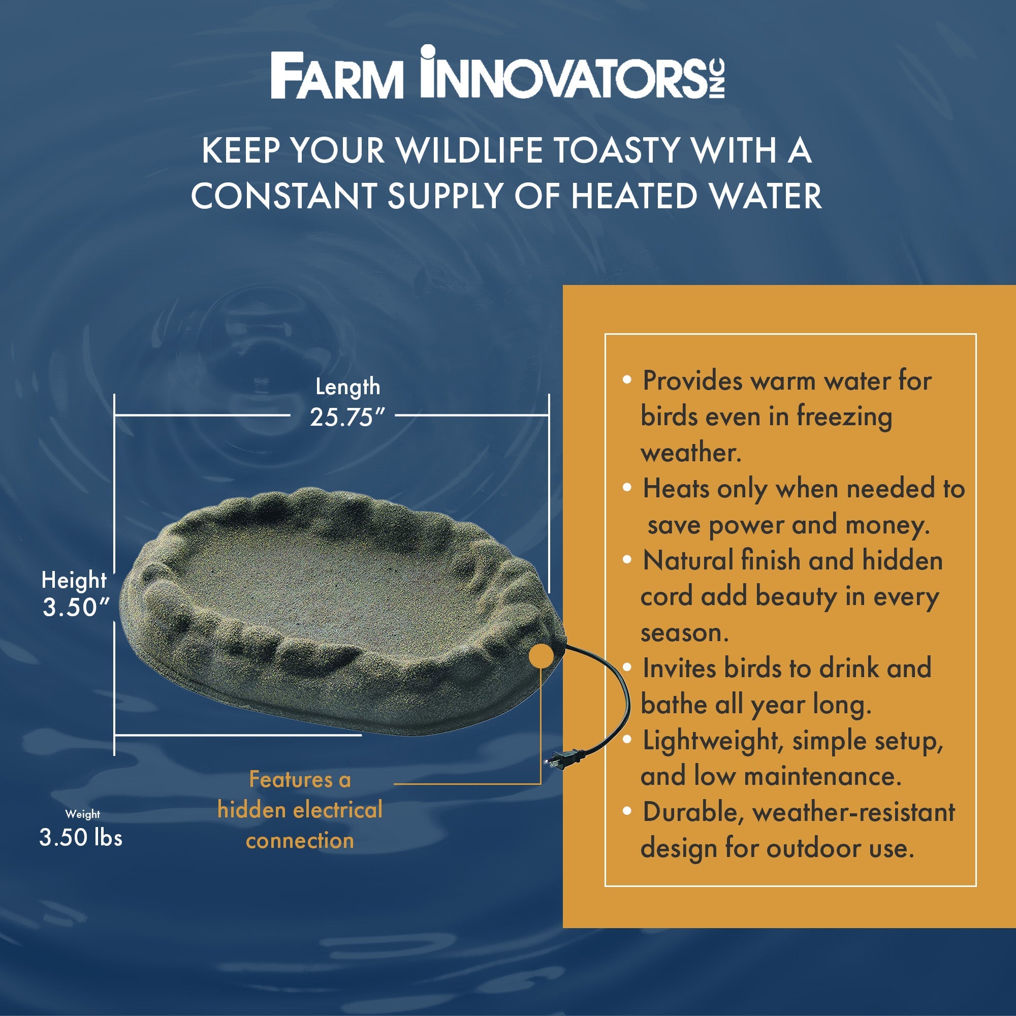 Let your robins, cardinals, and other feathery friends splash around outdoors all winter long in the Farm Innovators FS-1 Four Seasons Ground Heated Birdbath. Complete with a durable, natural look and user-friendly design, you can have a great view of birds in nature while the birds themselves can have a place to refresh.