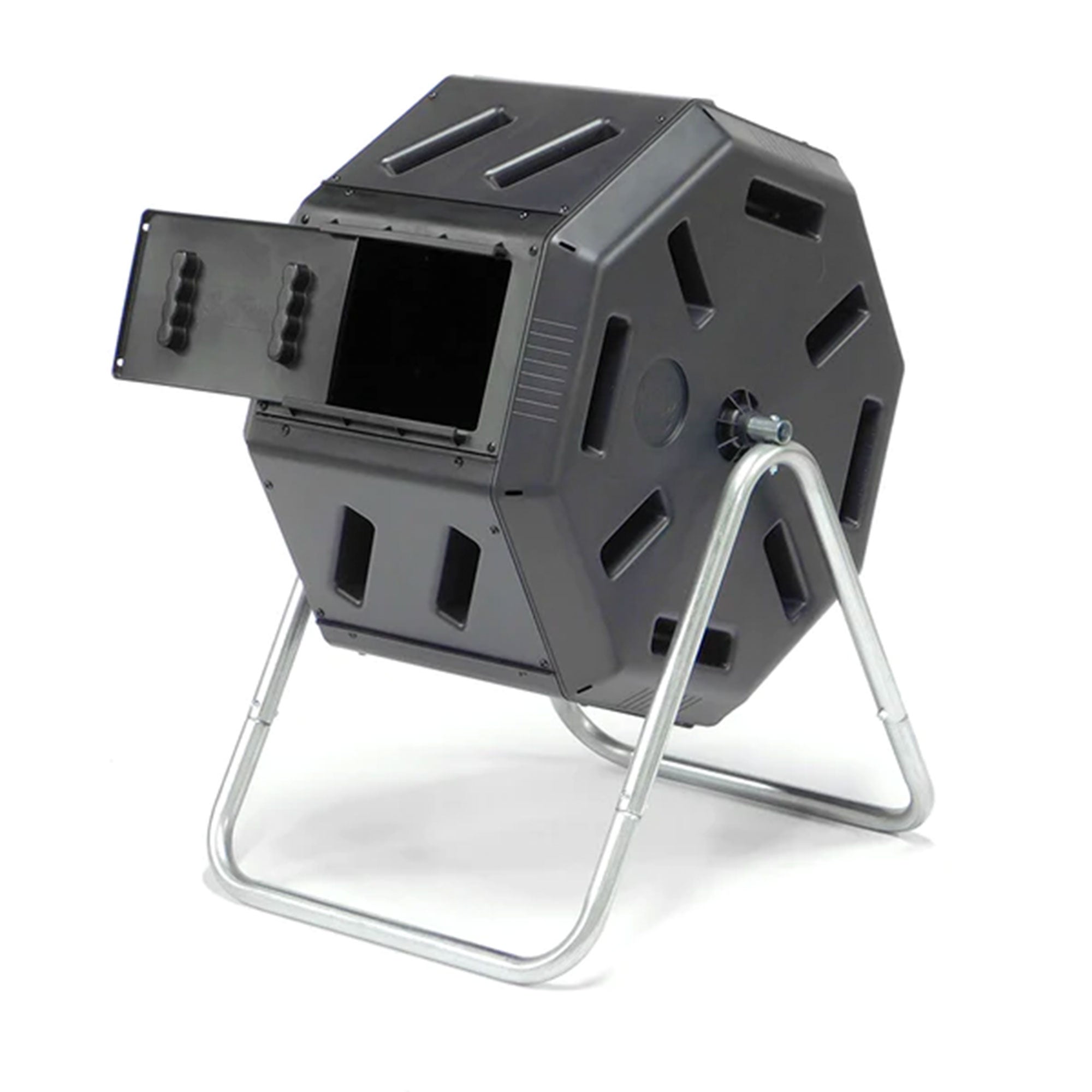 Fantastic for beginners, the large openings and removable door make it easy to toss in clipping and remove compost. The deep fins on the body provide ergonomic handholds so you can roll the compost around easily. This composter is constructed from recycled, Ultra Violet-inhibited, and BPA-free polyethylene plastic with a galvanized steel frame for reliable use.