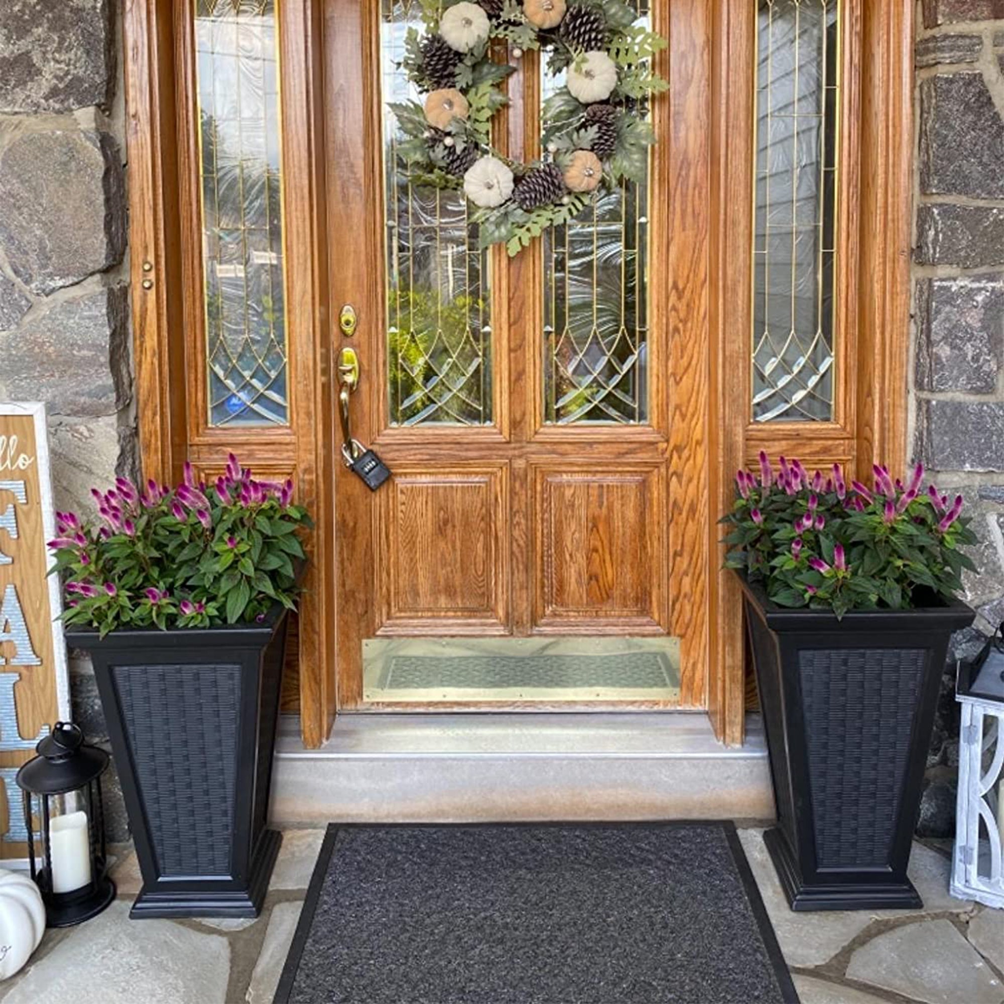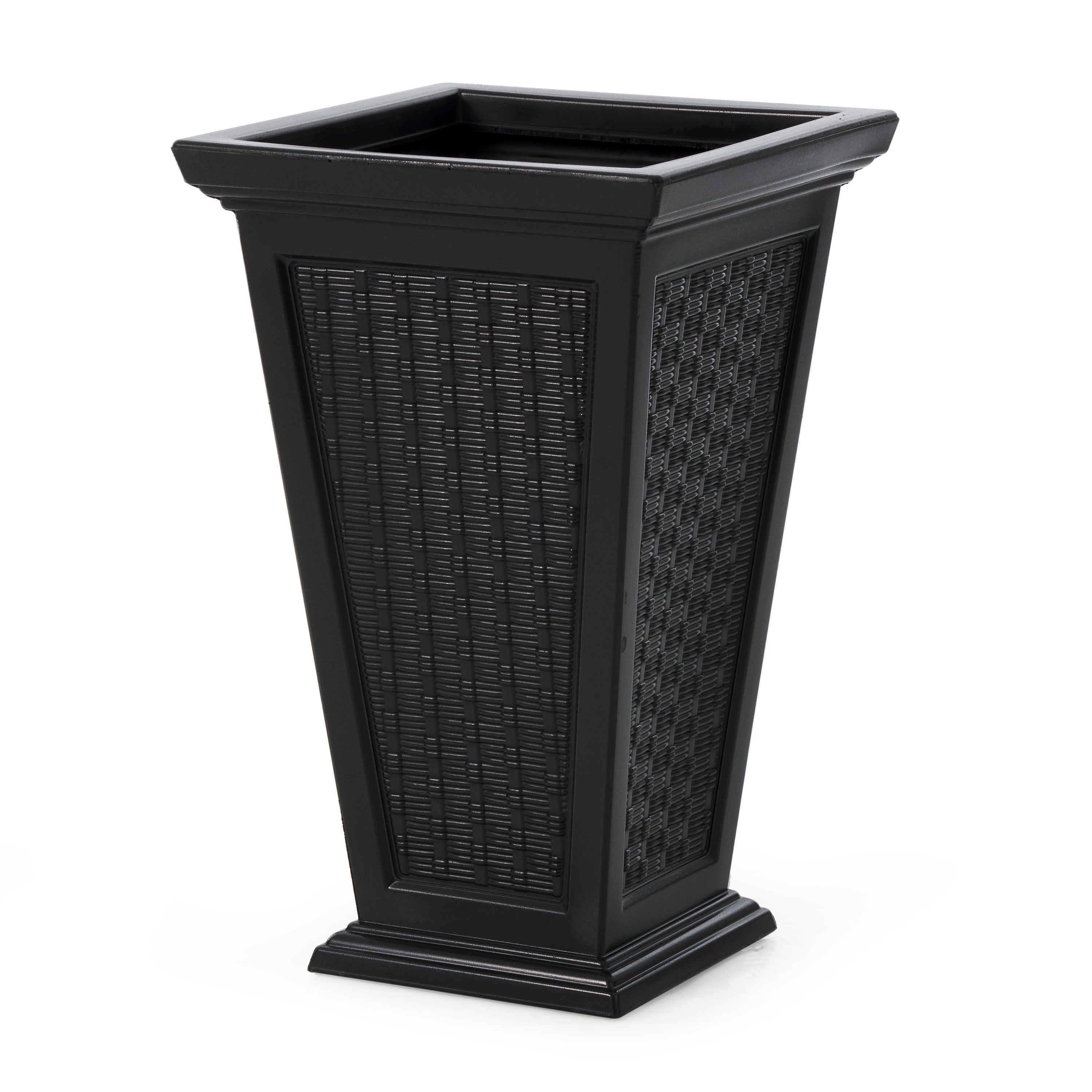 Each planter stands 24 inches tall and features a wicker-pattern design. High grade recycled resin that is BPA-free and UV inhibited means they will not fade in sunlight.