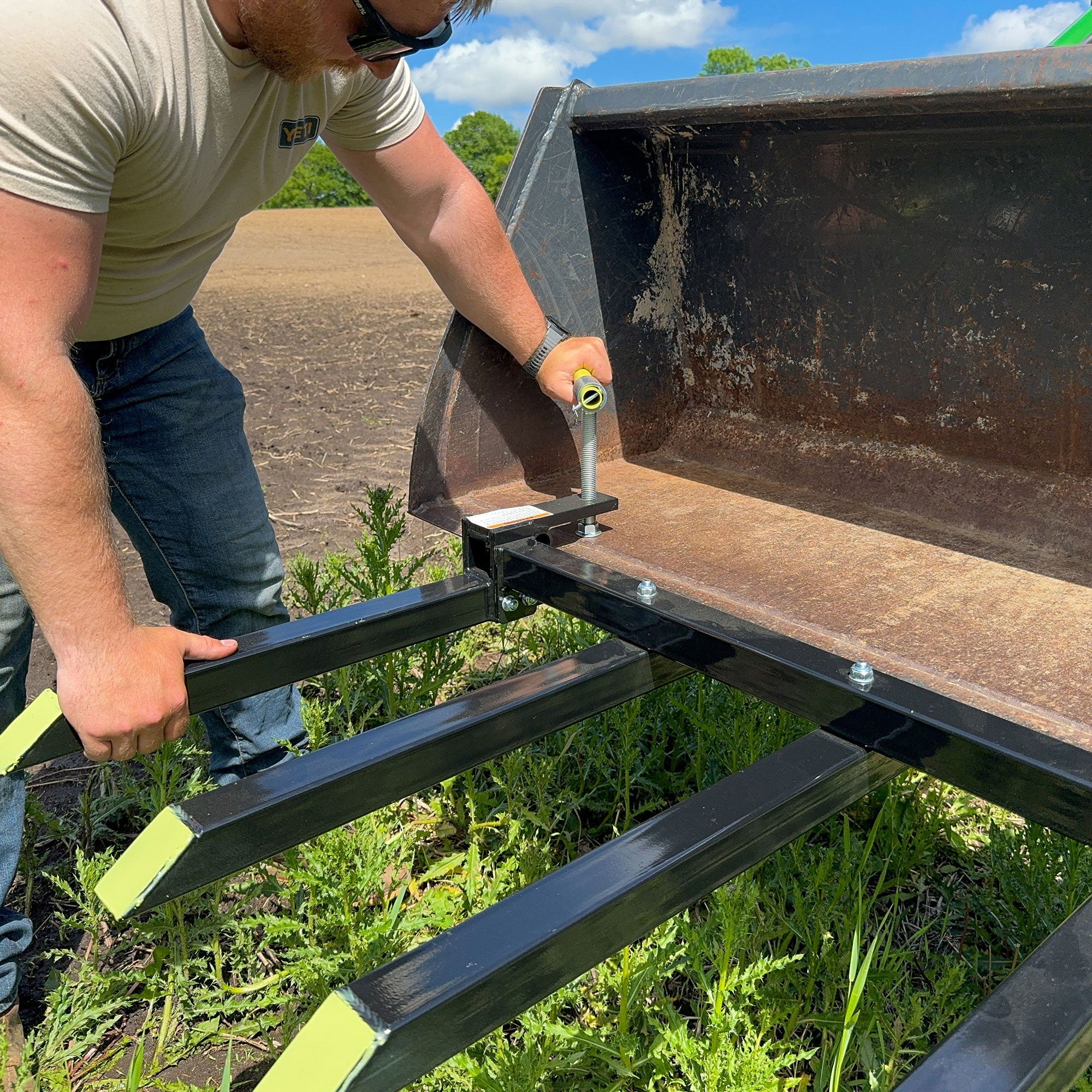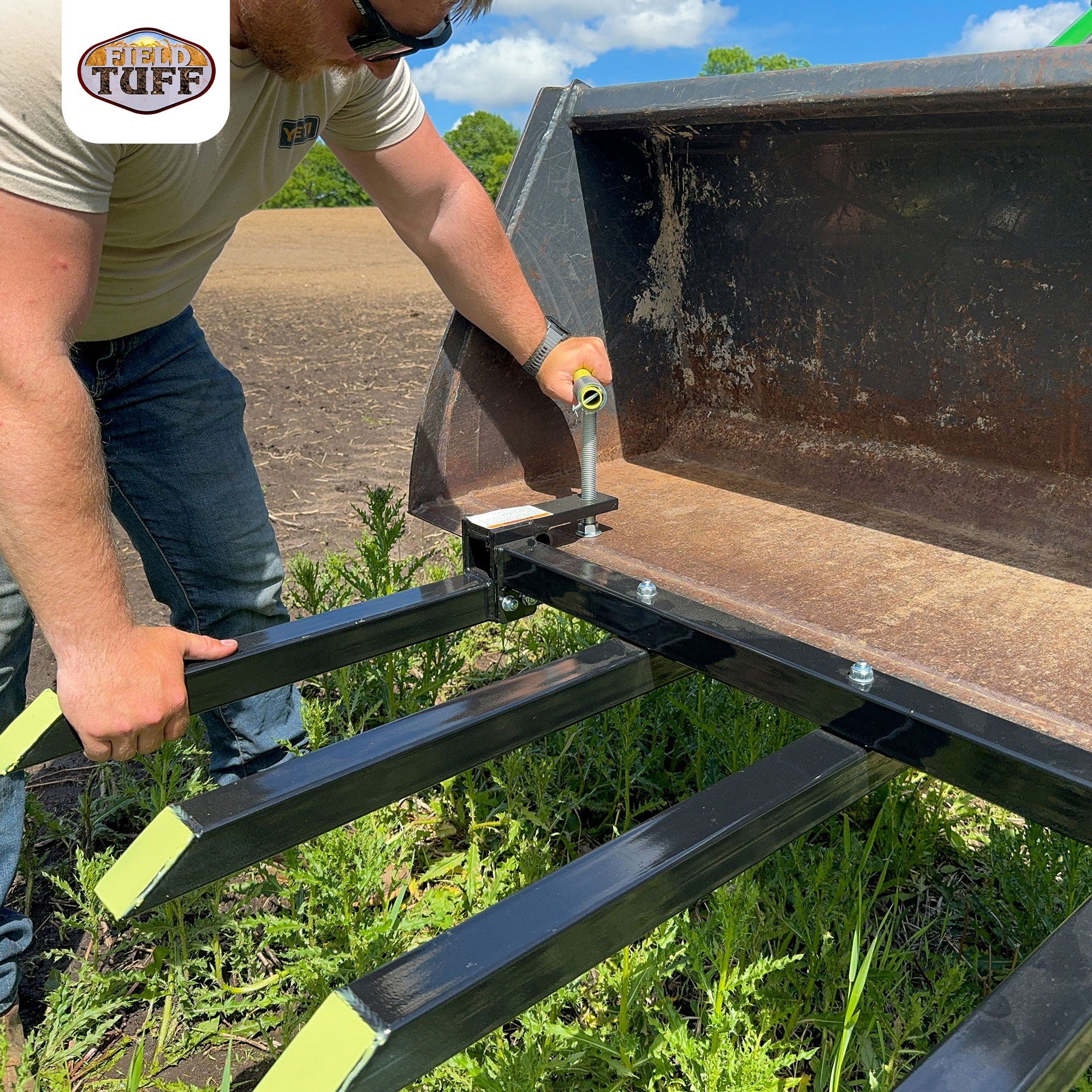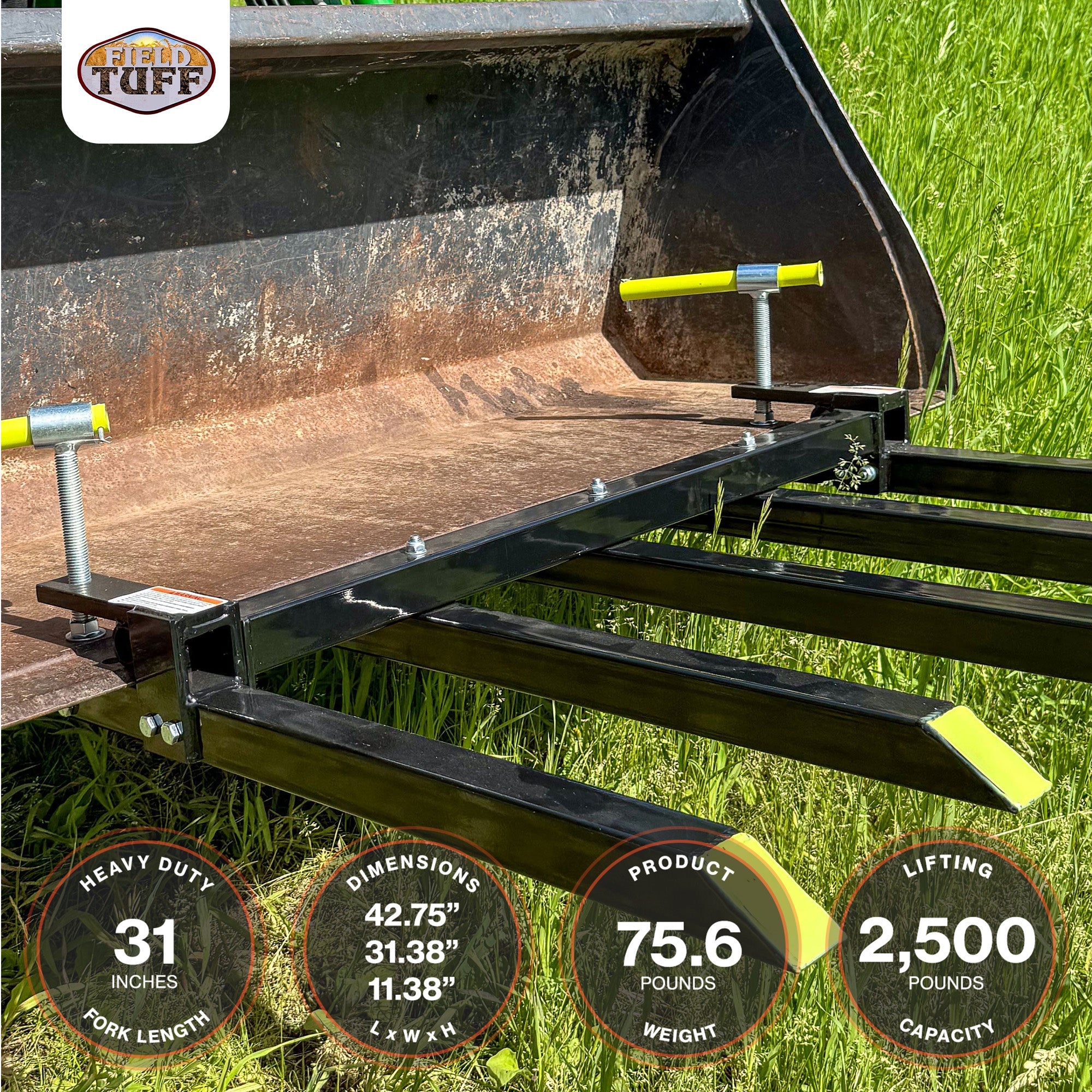 - Heavy Duty Debris Forks: Transform your tractor or skid loader into a powerful forklift with the Field Tuff Debris Forks