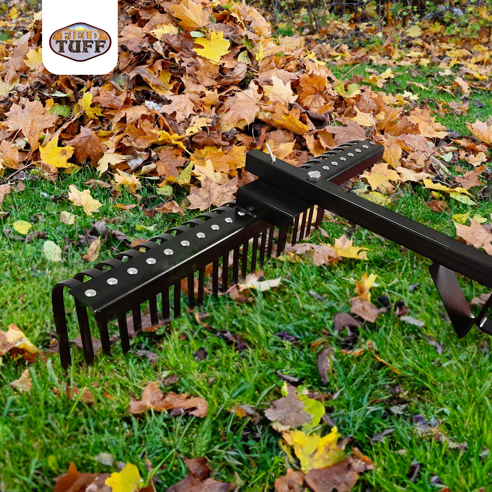 Grooming your lawn and removing rocks and sticks, the Field Tuff Sleeve Hitch Landscape Rake drags behind your lawn tractor to clear away debris.