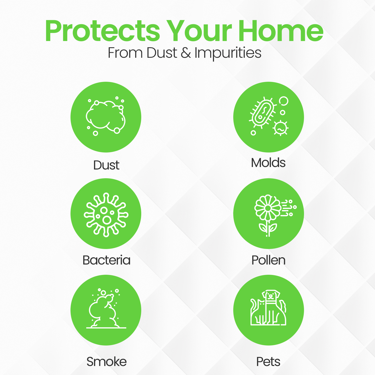 - Filters out and captures dust, pollen, pet dander, smoke, and other particles