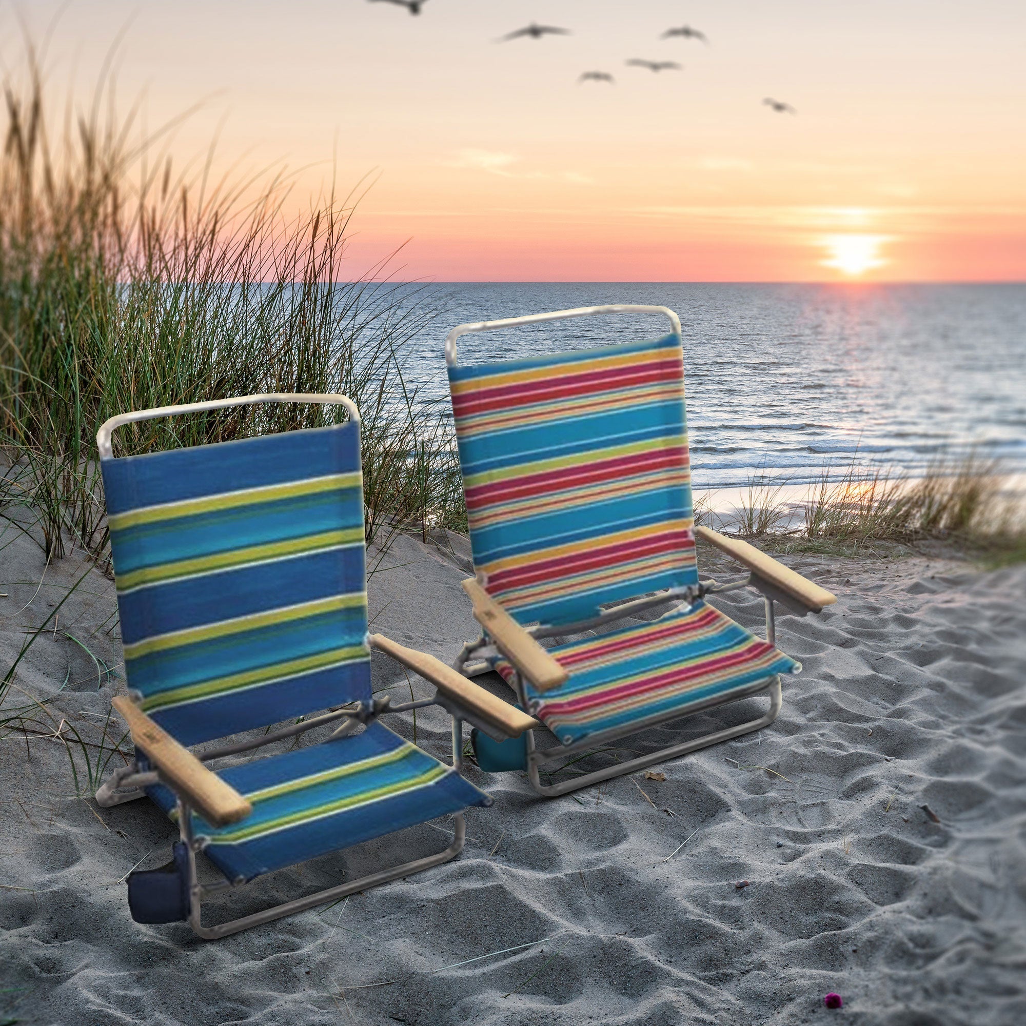 Skillfully crafted from top-tier materials, encompassing a rust-proof aluminum frame and sturdy solid wood arms, this deluxe 5-position sand chair seamlessly blends durability with sophistication. Revel in personalized relaxation as you explore its 5 adjustable positions, offering the flexibility to recline fully for a sun-drenched siesta or sit upright for convivial gatherings. Combining practicality with aesthetic allure, the chair showcases 600D polyester fabric in an array of colors and stripes, injecting a lively flair into your beach ambiance. With a robust 250-pound weight capacity and generous dimensions, including an 8-inch seat height, 20.25-inch width, and 14-inch depth, it caters to diverse body types while maintaining unwavering stability, ensuring your ultimate comfort as you unwind by the shore.