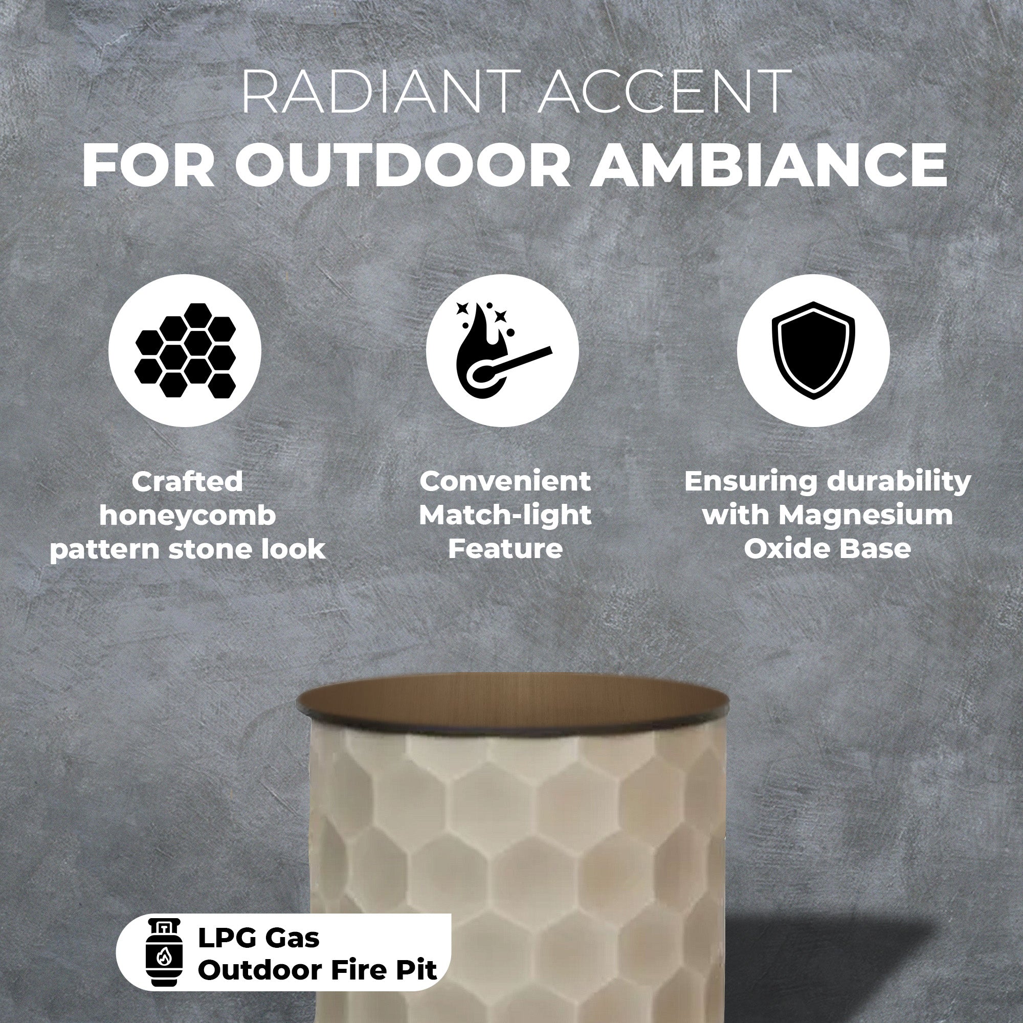 • Outdoor firepit featuring a meticulously crafted honeycomb-pattern stone look that effortlessly blends beauty and practicality