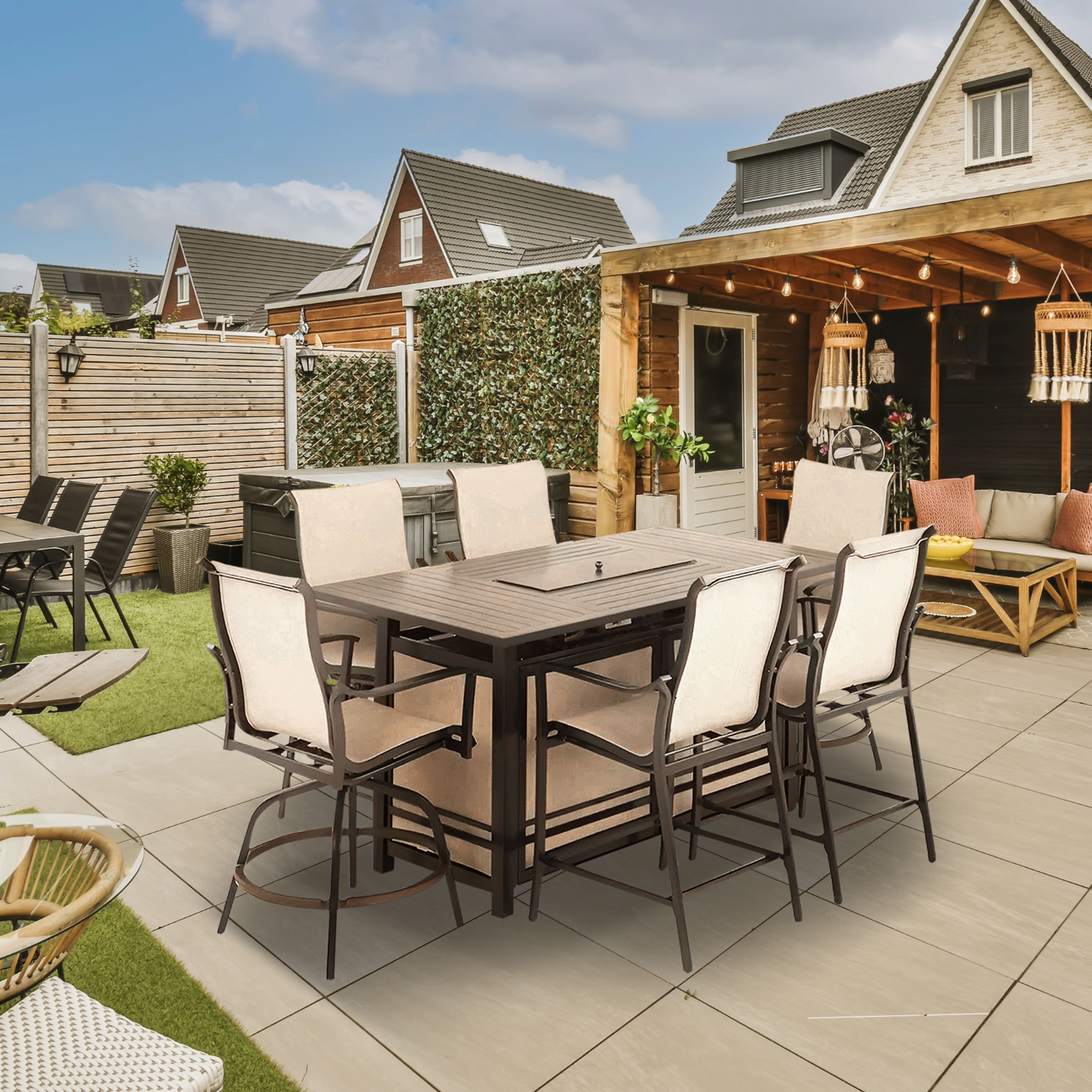 Each piece in this high dining chair set is built to withstand the elements, making it a resilient addition to your outdoor furniture collection. With a weight capacity of 250 pounds, these chairs and rockers offer both sturdiness and comfort for your guests to relax and enjoy outdoor meals or gatherings. For added warmth and ambiance, consider pairing this exquisite chair set with the matching gas firepit, available separately. Create an inviting atmosphere as you gather around the flickering flames, making your outdoor space the perfect setting for memorable moments.