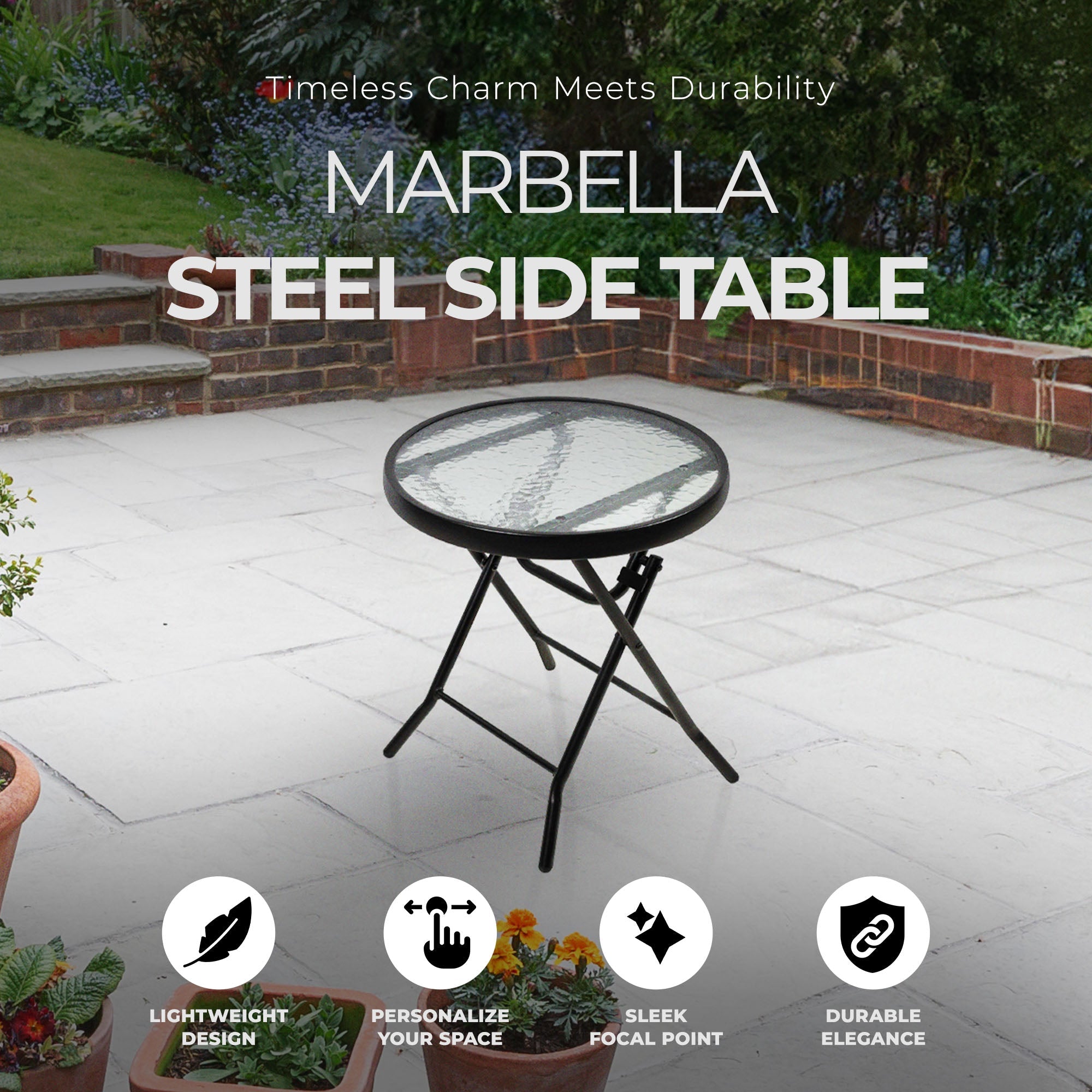 Measuring 16 inches in diameter, the round table provides ample space for your drinks, snacks, and accessories, while its smooth design eliminates sharp corners, ensuring safety and comfort. The unfolded dimensions of 16 inches in length and width and 18.11 inches in height make it the ideal table to complement your seating arrangements. Crafted from durable steel, this side table is built to withstand the elements. The steel construction adds a touch of sophistication with its sleek black finish on the rim and legs, beautifully contrasting with the glass top. The glass top is designed to handle the weight of your essentials and is easy to clean. When not in use, this table can be folded for convenient storage, making it an ideal choice for any outdoor setting, large or small. Perfectly paired with the Marbella Series chairs (sold separately), the Marbella side table completes your outdoor ensemble with grace and functionality.