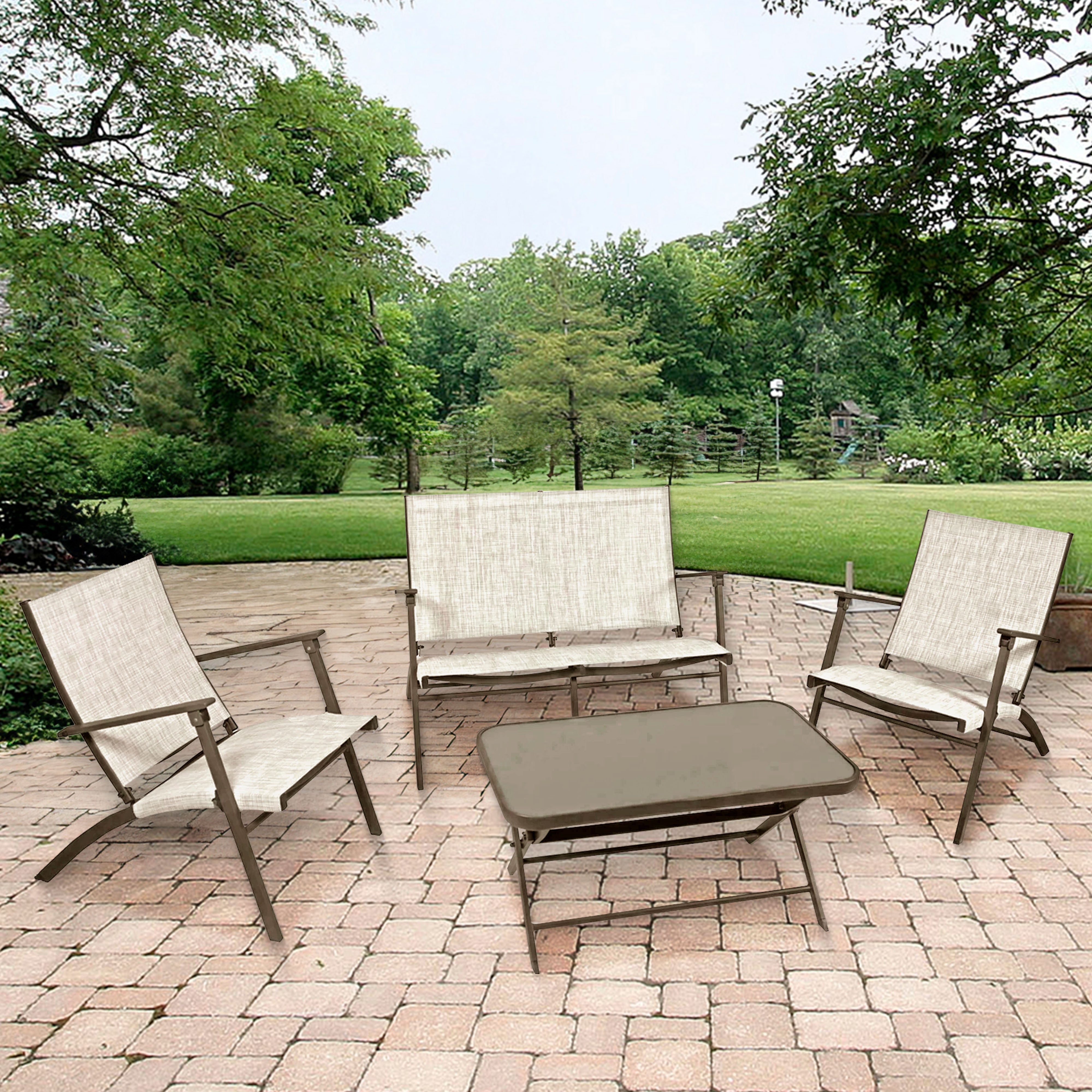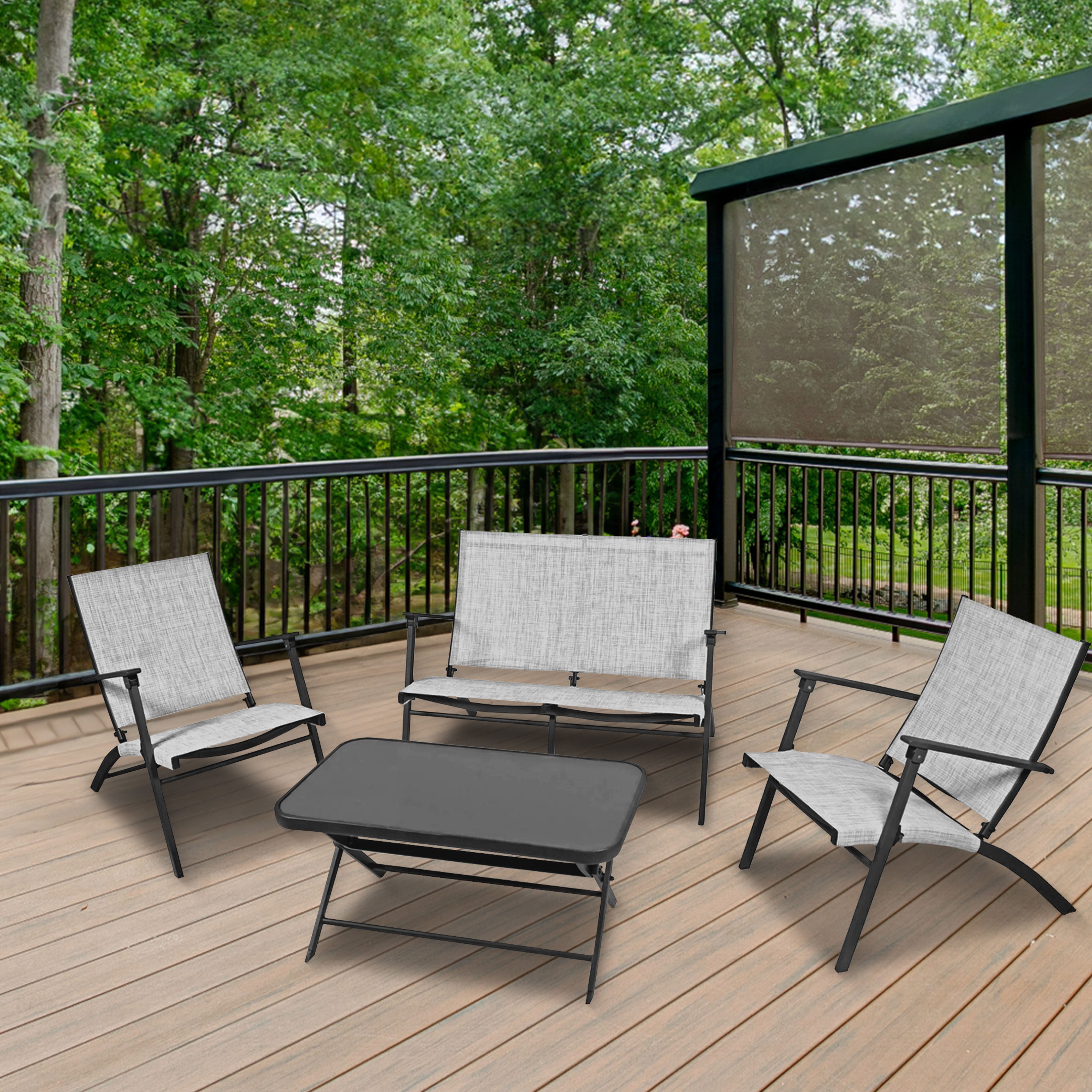 - Transform your outdoor space seamlessly with this 4-piece folding conversation set, effortlessly combining style, comfort, and functionality in a convenient ensemble