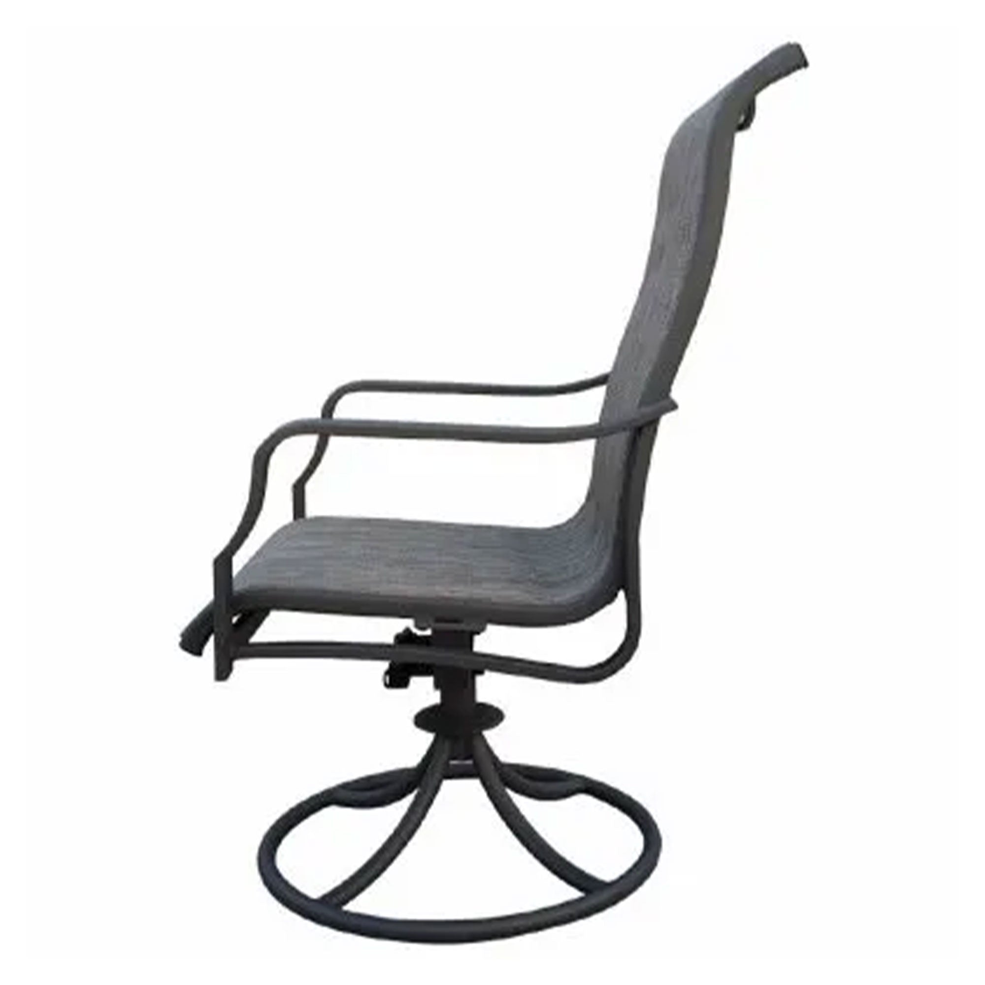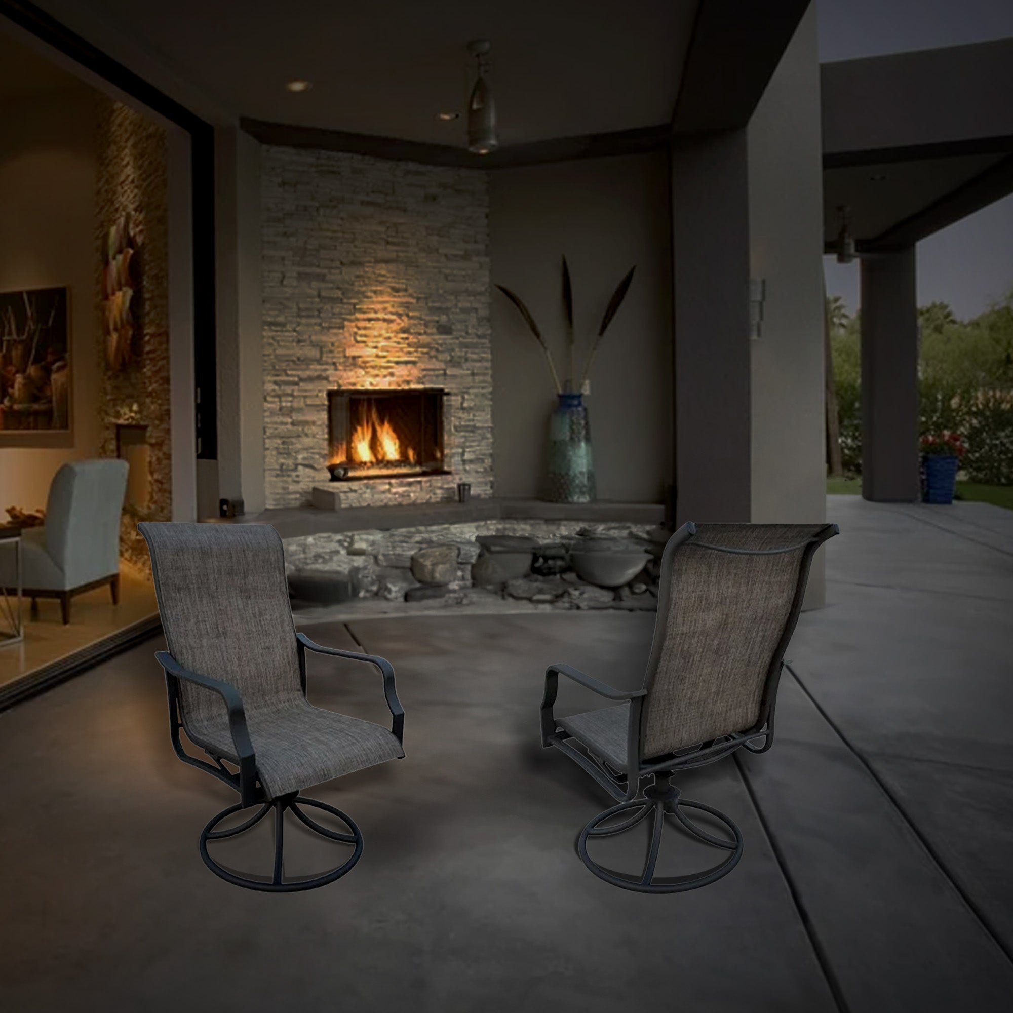 - Swivel rocker chair set to experience enduring comfort outdoors, featuring sleek aluminum frames and elegant sling fabric for a perfect blend of style and support