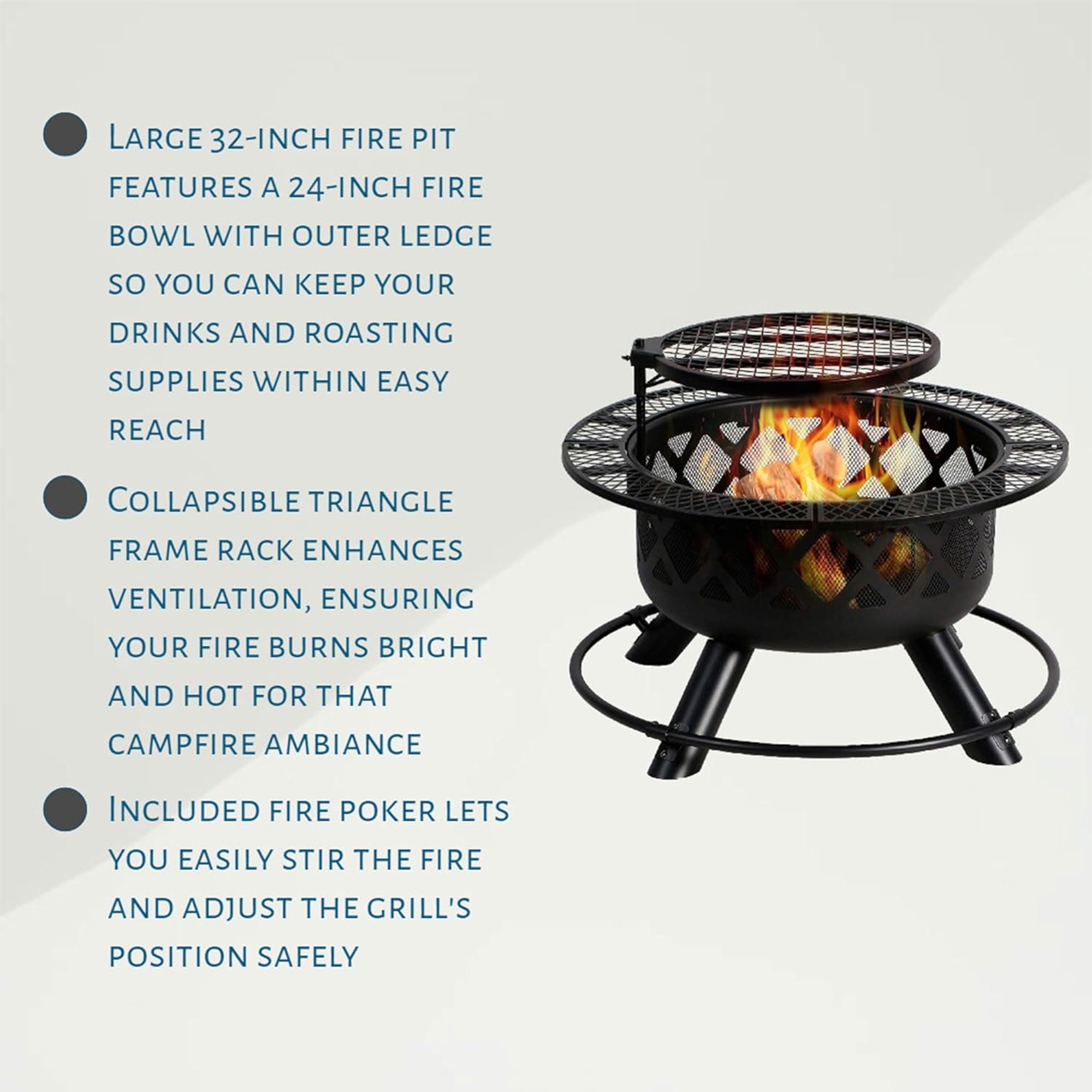 • Large 32-inch fire pit features a 24-inch fire bowl with outer ledge so you can keep your drinks and roasting supplies within easy reach