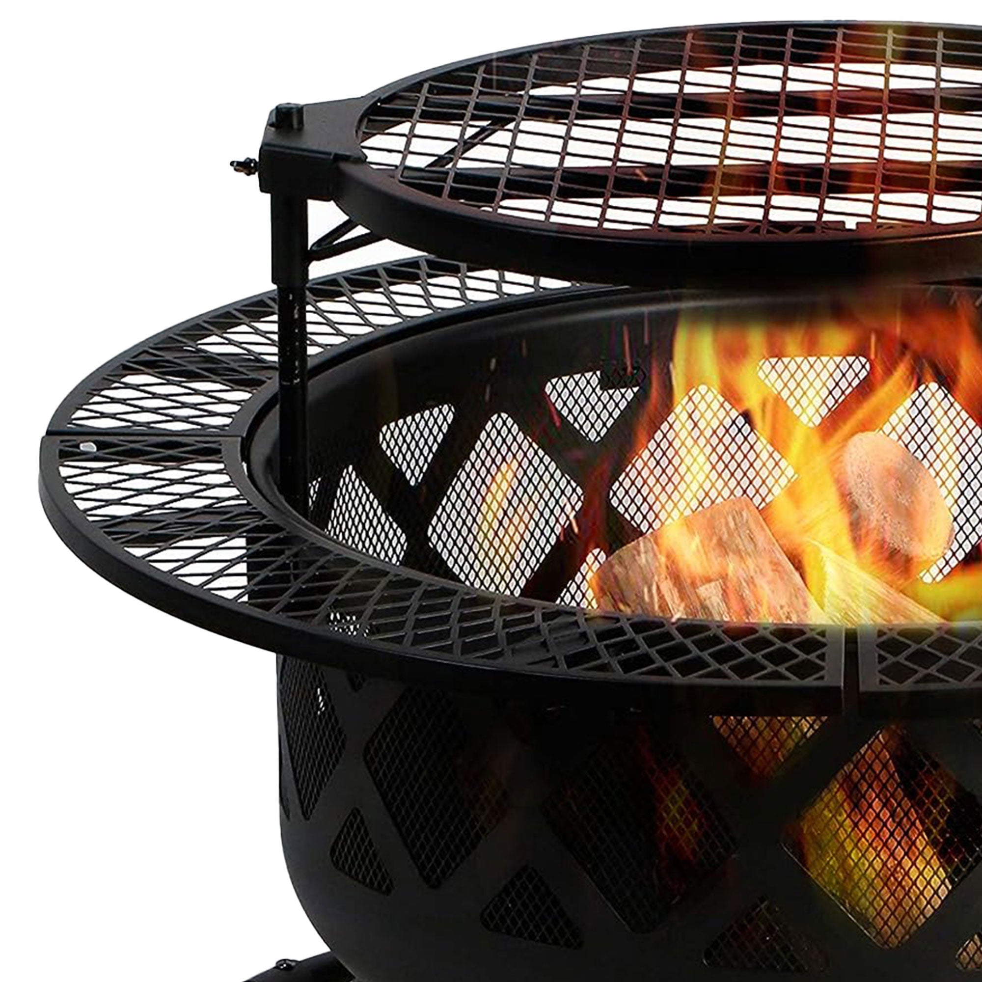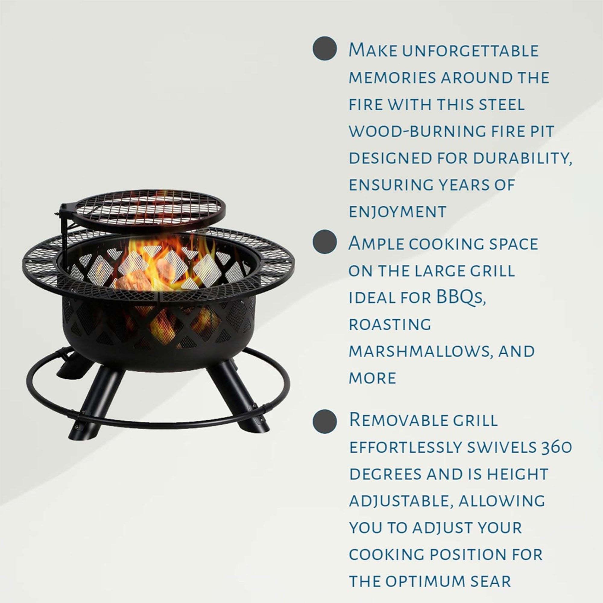 Crafted from durable steel, this fire pit is built to withstand the test of time, ensuring countless nights of warmth, whether you're camping or out on your backyard patio. The generously sized cooking grill offers ample space for your culinary creations, whether you're grilling up a storm or simply roasting marshmallows, offering a dual-purpose design for heating and grilling. The cooking grill swivels 360 degrees, granting you complete control over your cooking. You can also adjust the grill's height with ease, securing it firmly in place with screws for precision cooking, or you can remove the grill completely for a single wood-burning campfire.