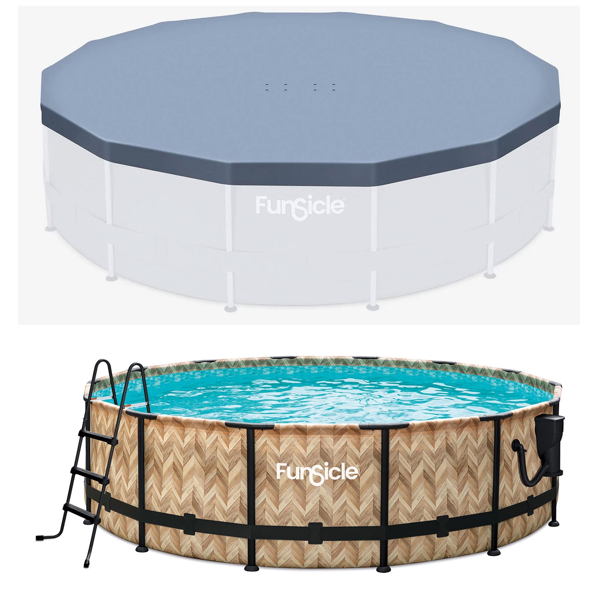 Crafted for convenience, this cover features an adjustable drawstring for effortless usage, ensuring your pool stays pristine year-round. Its durable materials resist punctures, while strategically placed drain holes prevent water buildup, maintaining your pool's integrity. Designed explicitly for 14-foot round pools, its sleek gray color seamlessly complements your outdoor space, providing reliable and efficient protection. Pair it with the Funsicle Oasis Designer Pool for unrivaled luxury. Boasting an elegant Oak Herringbone print liner, this pool comfortably accommodates 6 to 7 people, perfect for family gatherings or entertaining guests. Setting up is a breeze with Funsicle's SmartConnect technology, ensuring a sturdy structure all summer. The modern matte finish on the ultra-strong oval poles deters scratches and corrosion, ensuring durability and longevity. But the luxury doesn't stop there. Our Oasis Designer Pool comes equipped with a powerful SkimmerPlus Filter pump, which is attached conveniently to the side of the pool to prevent tripping hazards.