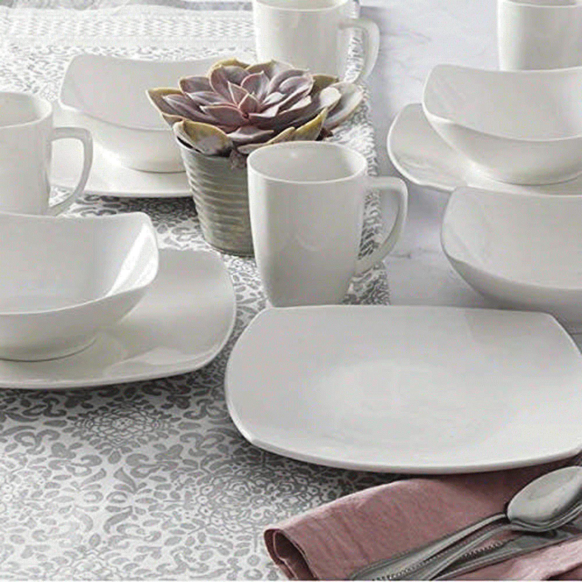 Your dinner guests will admire the presentation of their meal on the Gibson Porcelain Zen Buffet 16 Piece Square Dinnerware Set 2-Pack. This dining set has an elegant mid-century modern white design and will create memorable tablescapes for your dining pleasures.