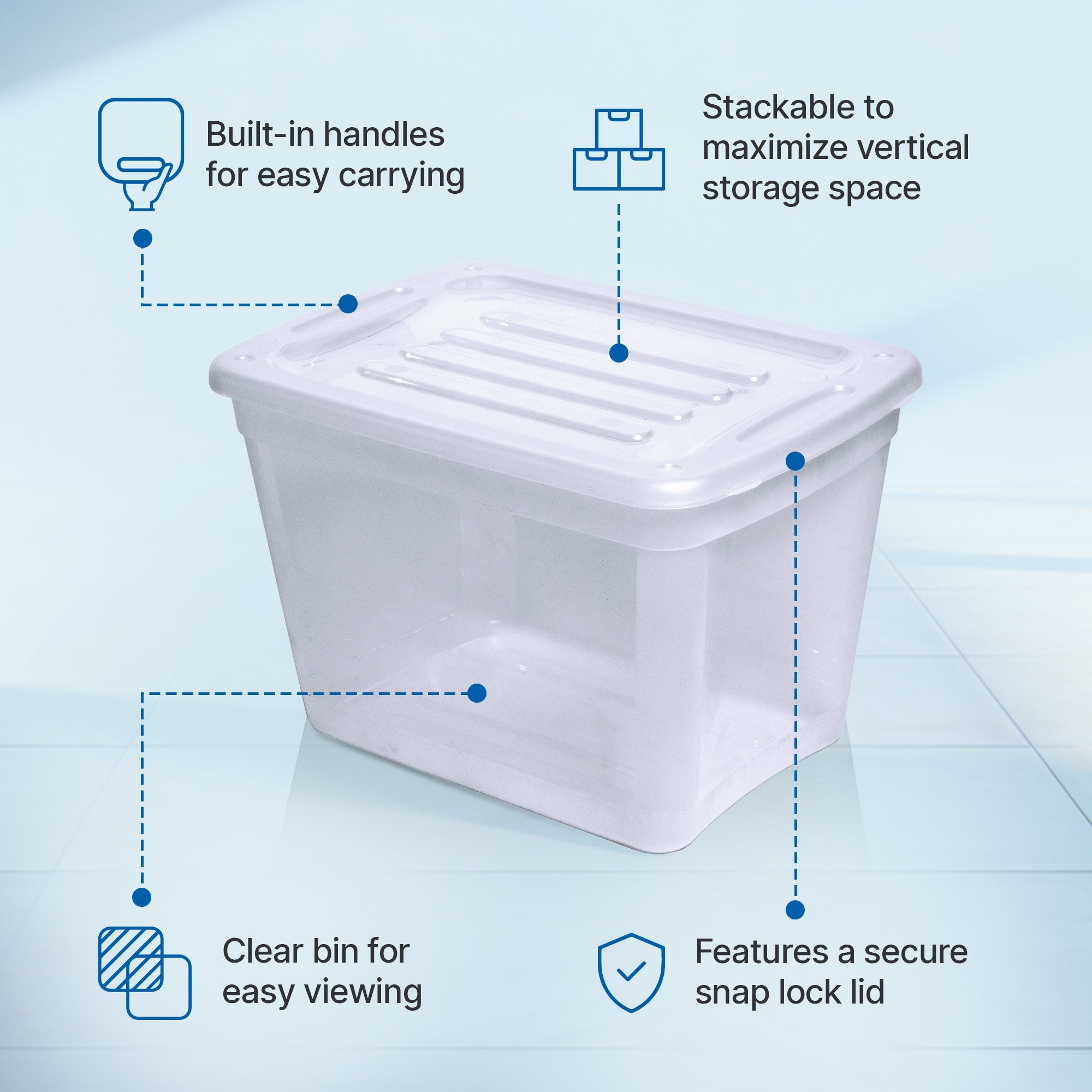 - Built-in handles for easy carrying so you can efficiently fill, move, and store your clear bins