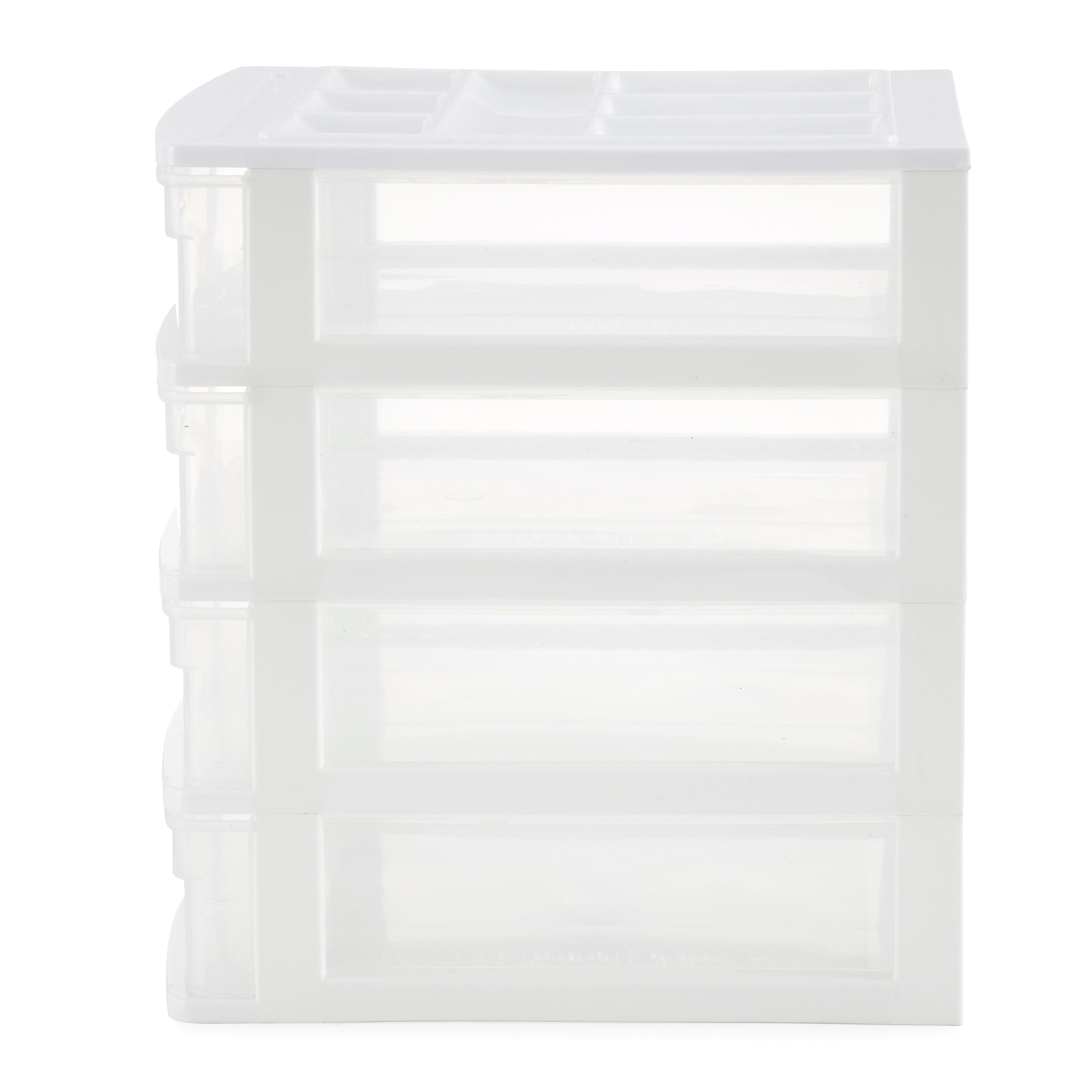 This desktop storage solution features 4 smooth-gliding drawers with handles for easy access to your items inside and a clear design for easily viewing and finding your items. With 4 drawers, you can use this plastic drawer unit as a makeup organizer, nail polish organizer, for small kitchen accessories, or for storing office desk accessories like pens and paperclips. The storage possibilities are endless! The handy 8.5 by 11-inch drawer provides convenience for your standard paper-sized supplies. Plus, the organizer lid keeps smaller items neatly in place helping to keep your desk clear of scattered items