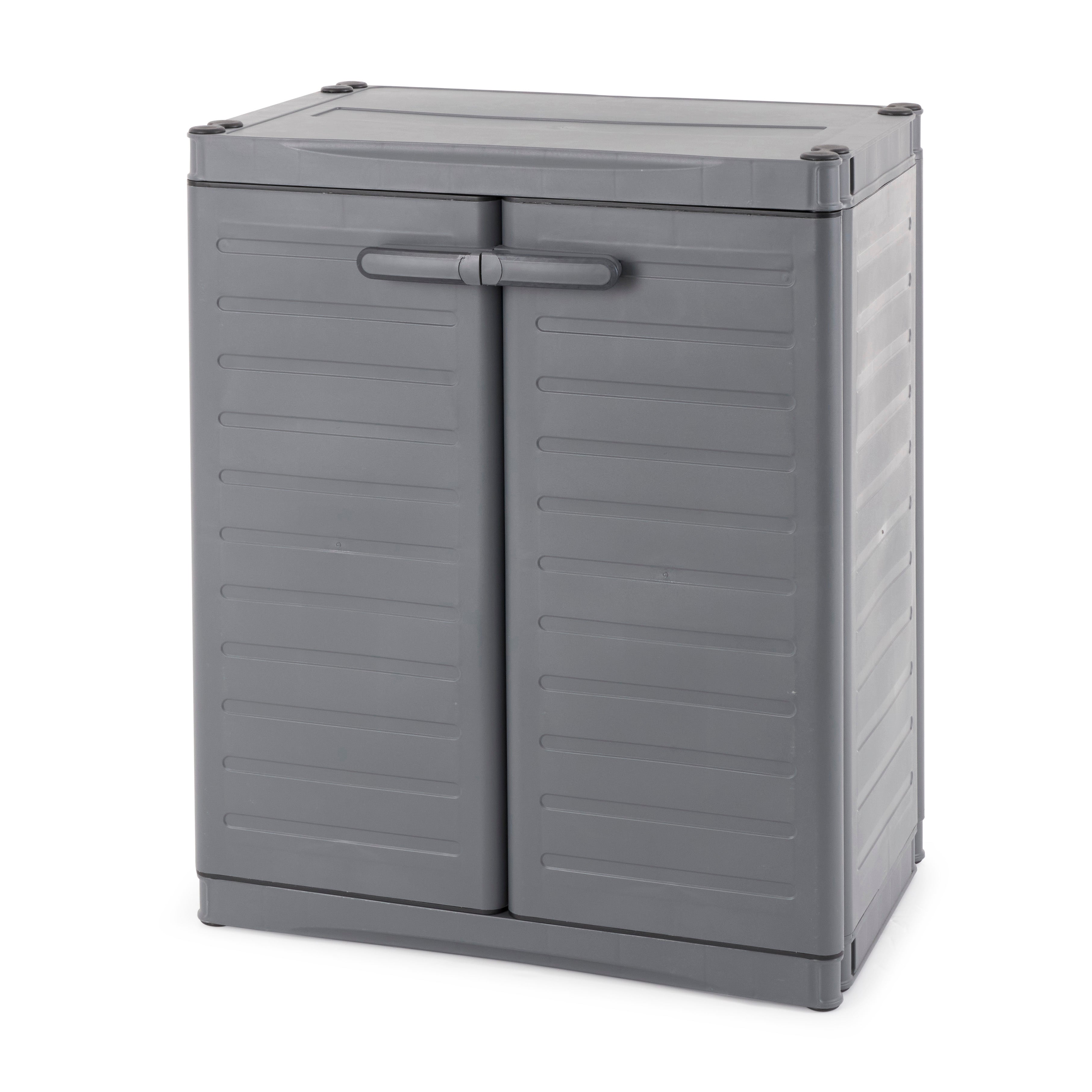 This is the perfect storage solution for your garage, basement, or utility room. This cabinet's construction makes it durable, but also light enough that it is easy to relocate. Unlike wood or metal, this base cabinet will not rot, rust, or peel, giving you peace of mind with its durable construction. This heavy-duty 2-door cabinet includes a small door storage bin along with 2 fully adjustable shelves, accommodating a variety of storage need. The metal shelves are sturdy and less likely to warp over time compared to shelves constructed of other material, so you can count on this 2-shelf storage cabinet to withstand years of use. Safety and security are provided with the ability to lock the doors (lock sold separately), ideal for keeping your valuables out of sight and keeping children safe from hazardous chemicals. No tools, no problem, as this cabinet does not require any tools for assembly, giving you a headache-free setup process.