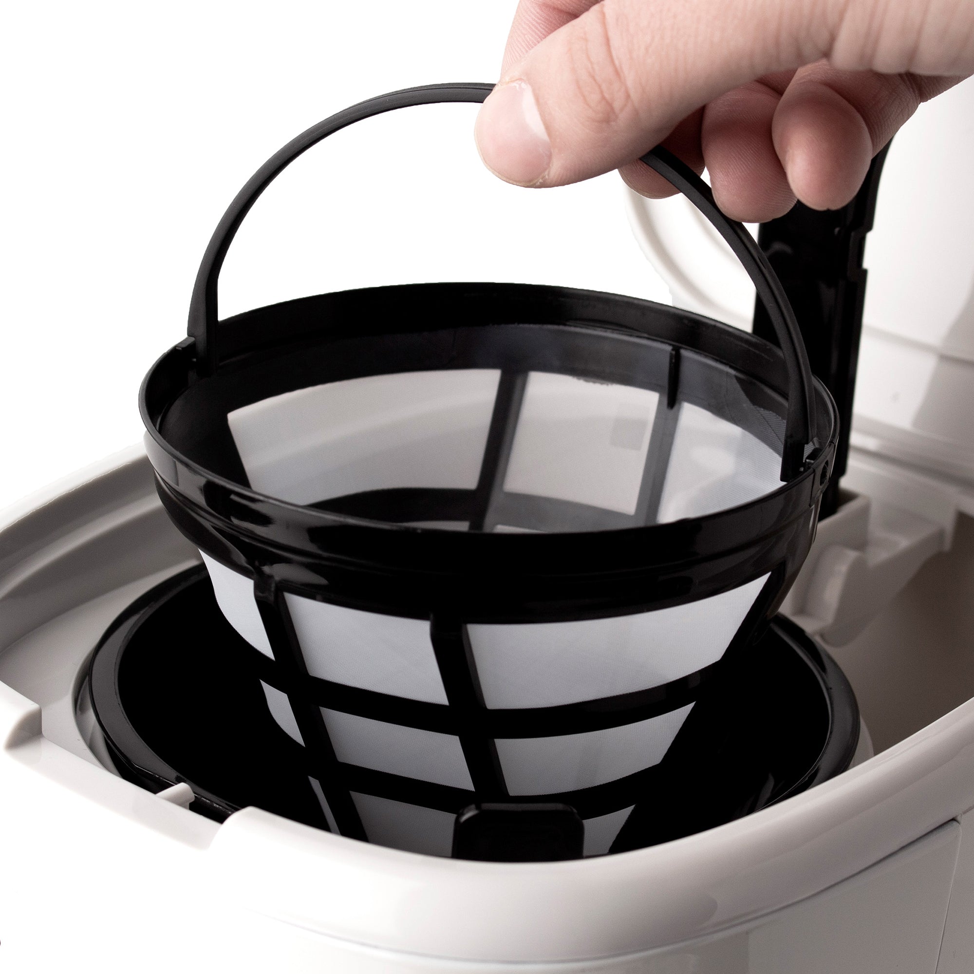 Pour your hot coffee and serve your guests with ease using the glass coffee pot’s large handle, while the lid helps to control the flow. For ease of maintenance, the machine’s removable water filter can be washed and reused.