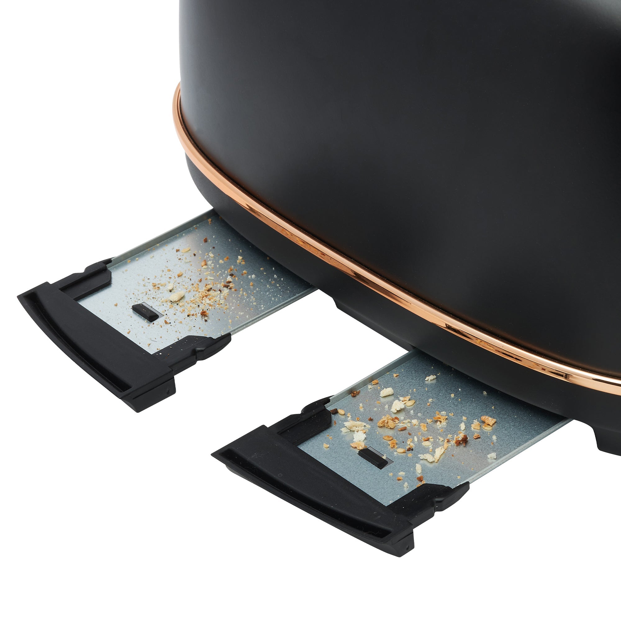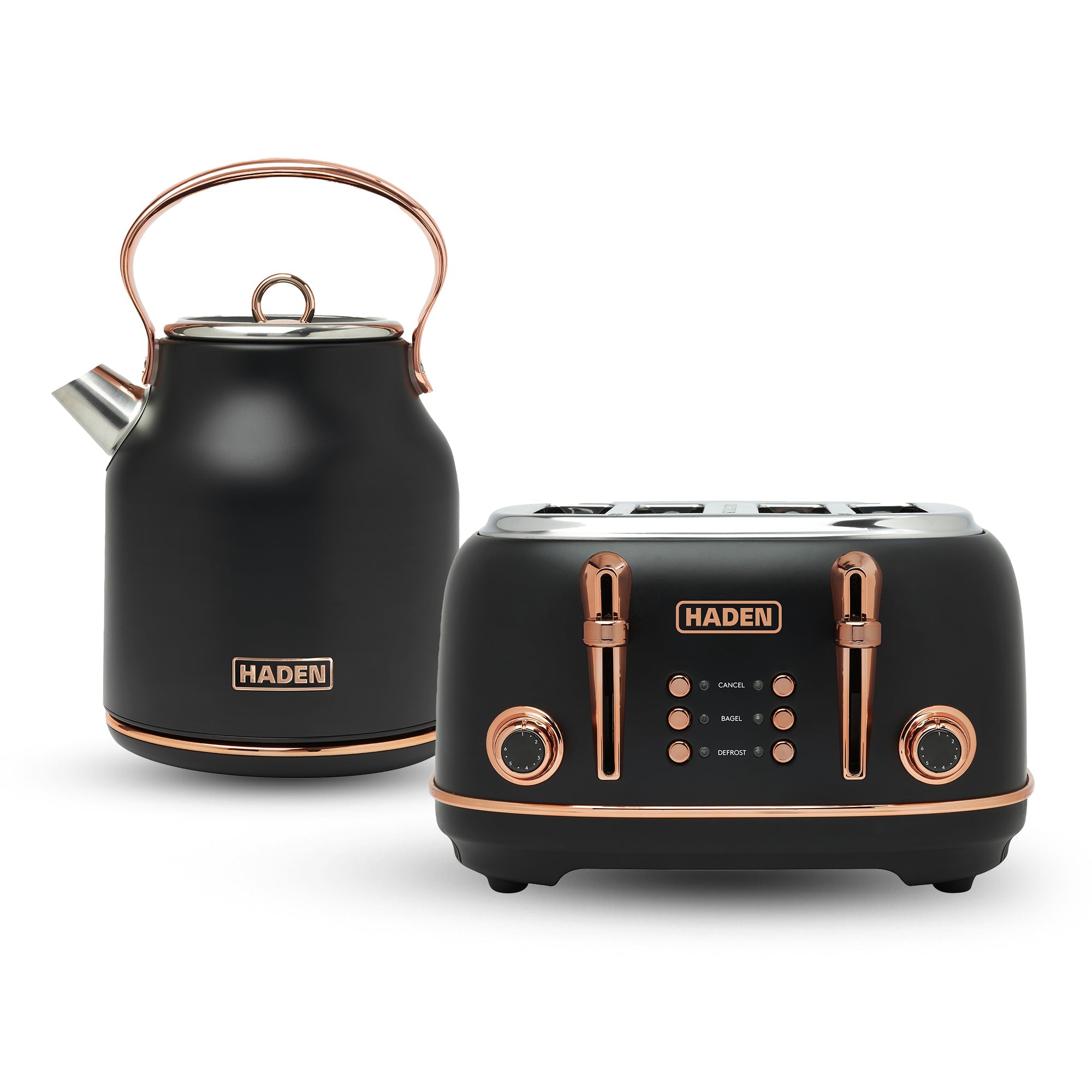 Inspired by British homes, architecture, and landscapes, this HADEN Heritage toaster and kettle feature a chic Black & Copper color scheme.