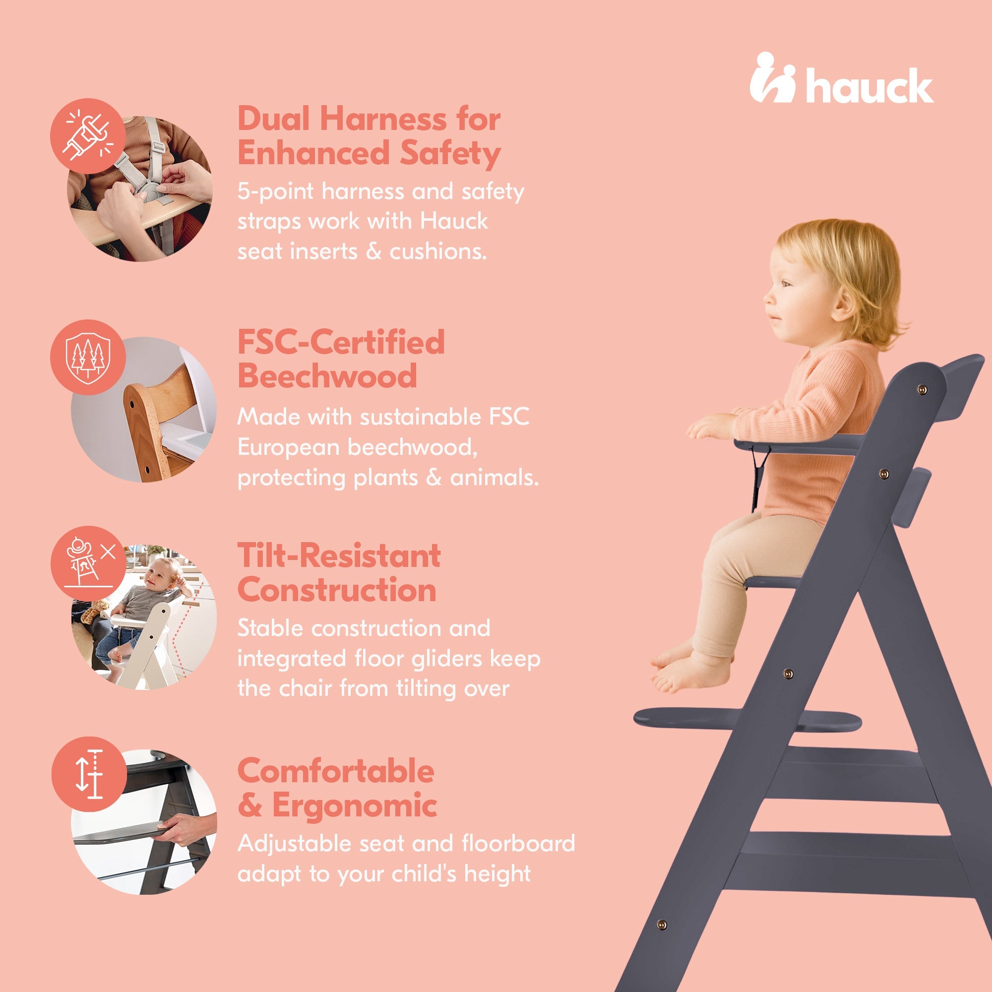 Alpha+ high chairs for babies and toddlers pack a number of features for a worry-free experience for first-time parents and experienced parents alike. This baby high chair is carefully constructed from European Beechwood that is Forest Stewardship Council certified. You know that what you buy for your baby is sustainable and ethically sourced.